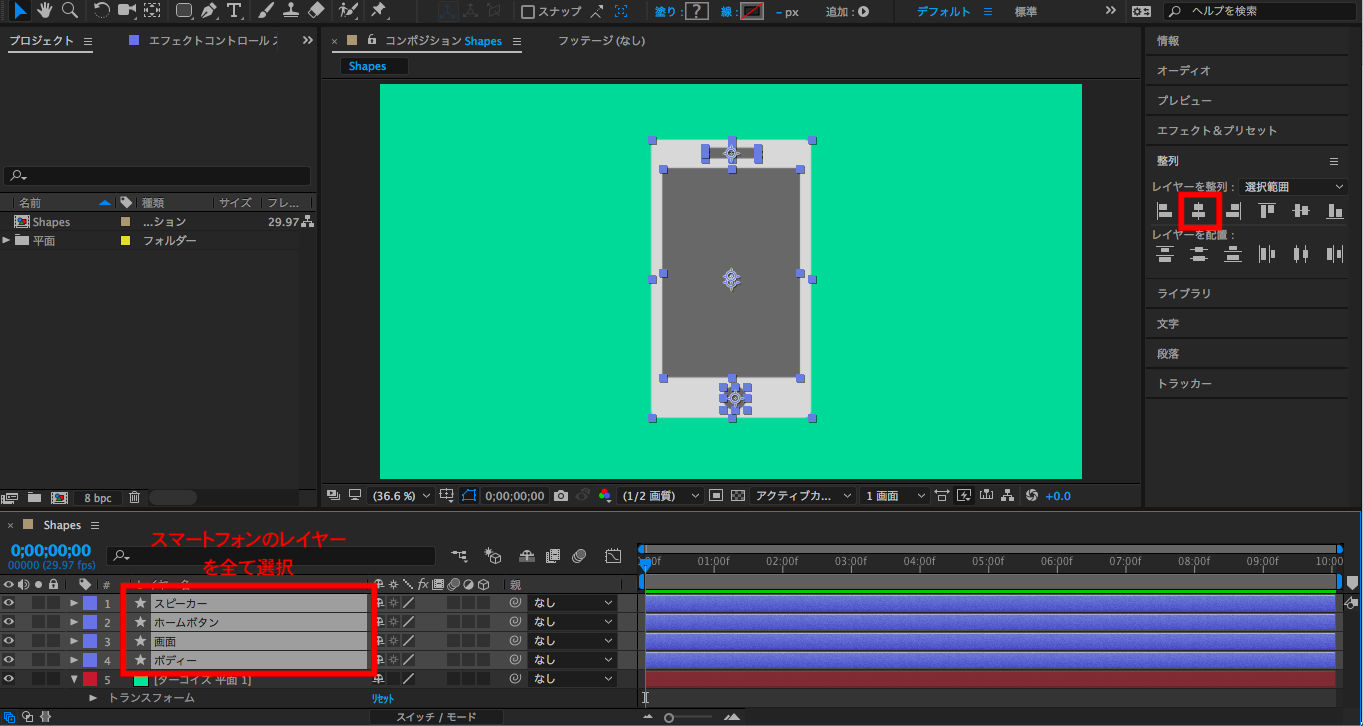 シェイプが上手く中央に揃っていない場合は、スマートフォンのレイヤーを全て選択して、右にある「整列」タブから「水平方向の中央に整理」をクリックすることで、全てのオブジェクトが中央に整理されます。これで、スマートフォンのデザインが完了です。