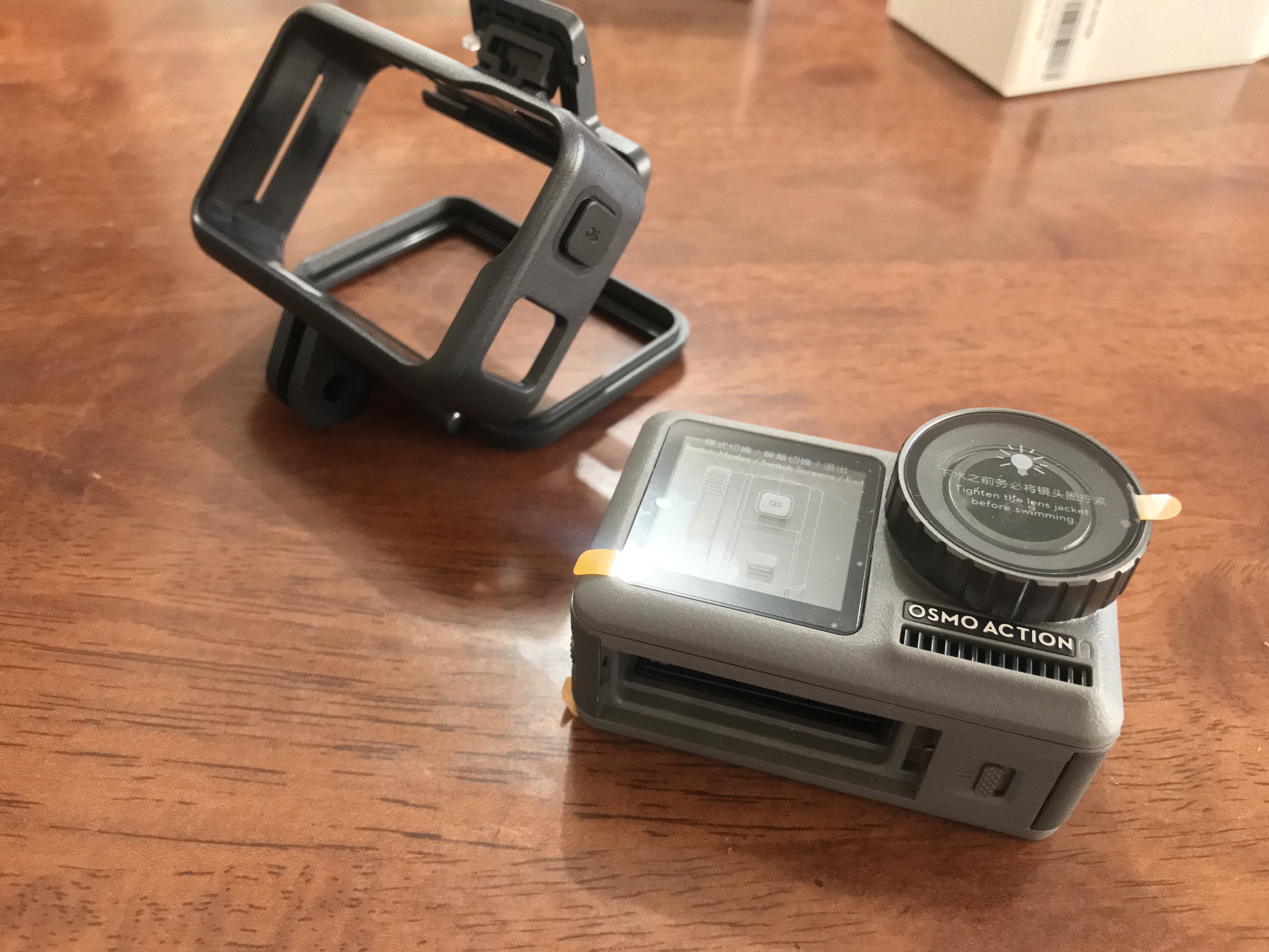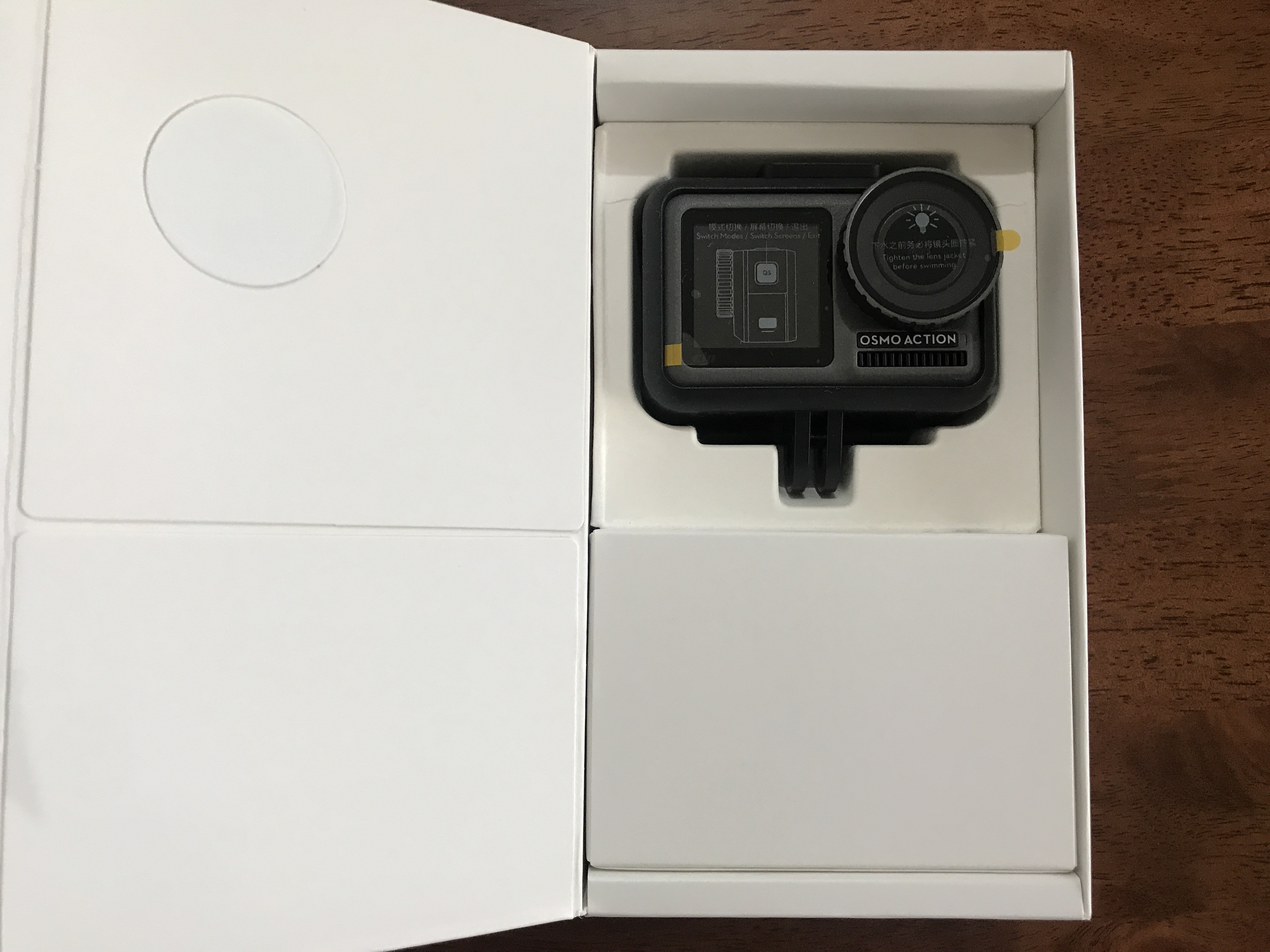 パッケージ側面に貼られているテープを剥がすと、カメラフレームに入ったOsmo Actionが現れます。
