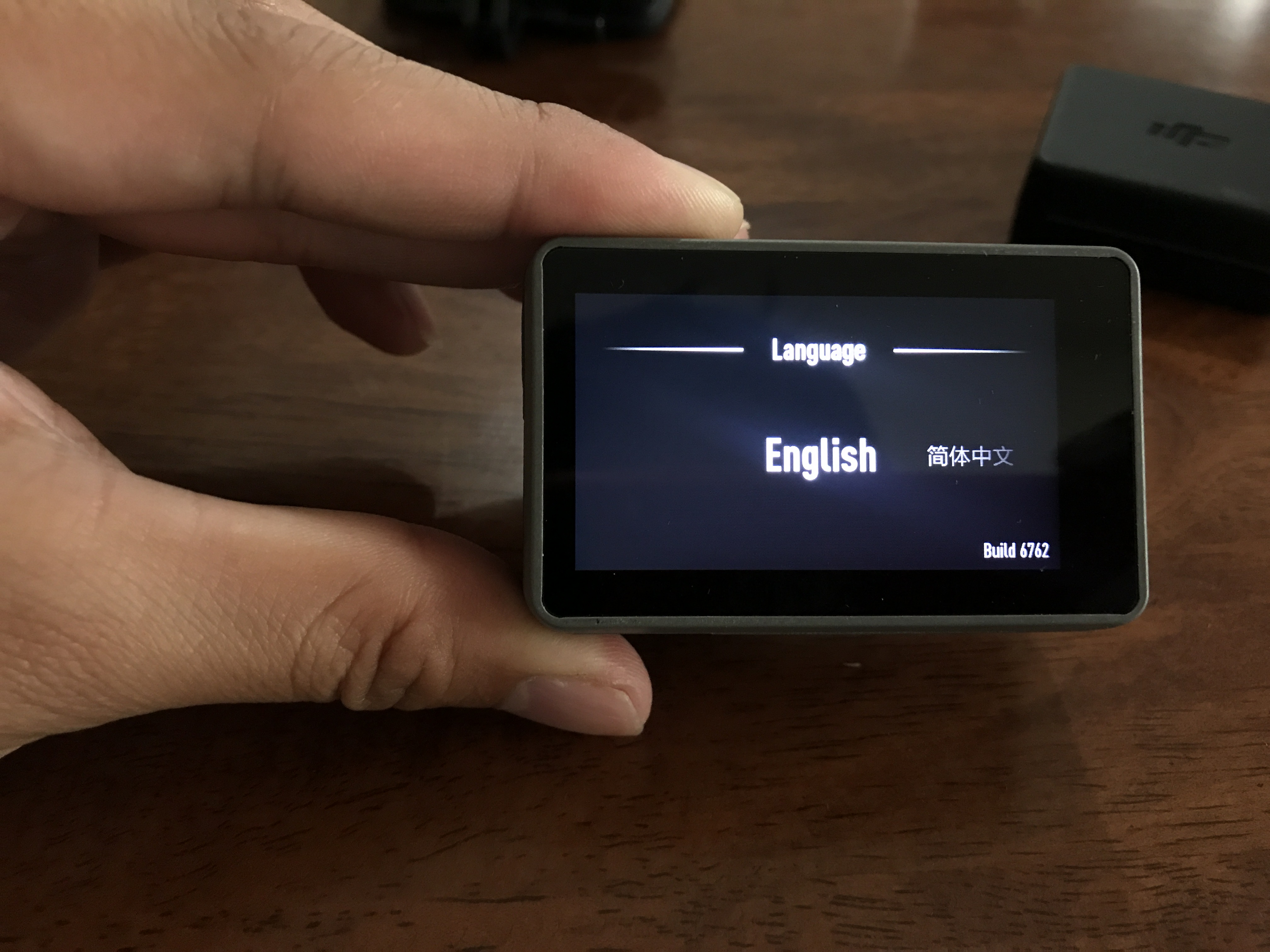 Osmo Actionのレンズやディスプレイ部分に貼ってある保護フィルムを剥がして、電源ボタン(DISPボタン)を押して起動すると、言語設定が現れるので好きな言語を設定しましょう。