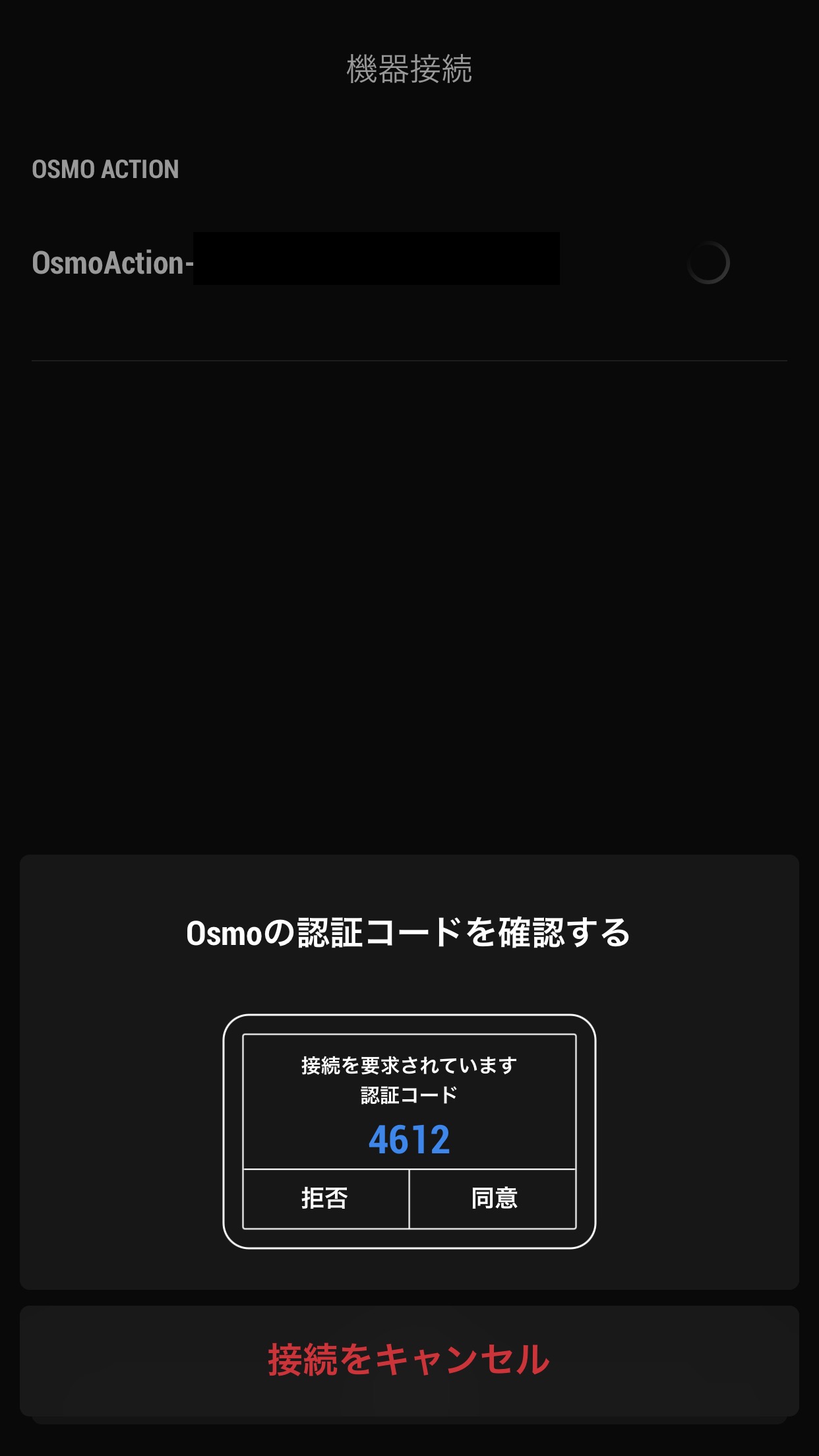 次の画面で認証コードが現れるので、同じコードが表示されていたらOsmo Action側で「同意」をタップしましょう。