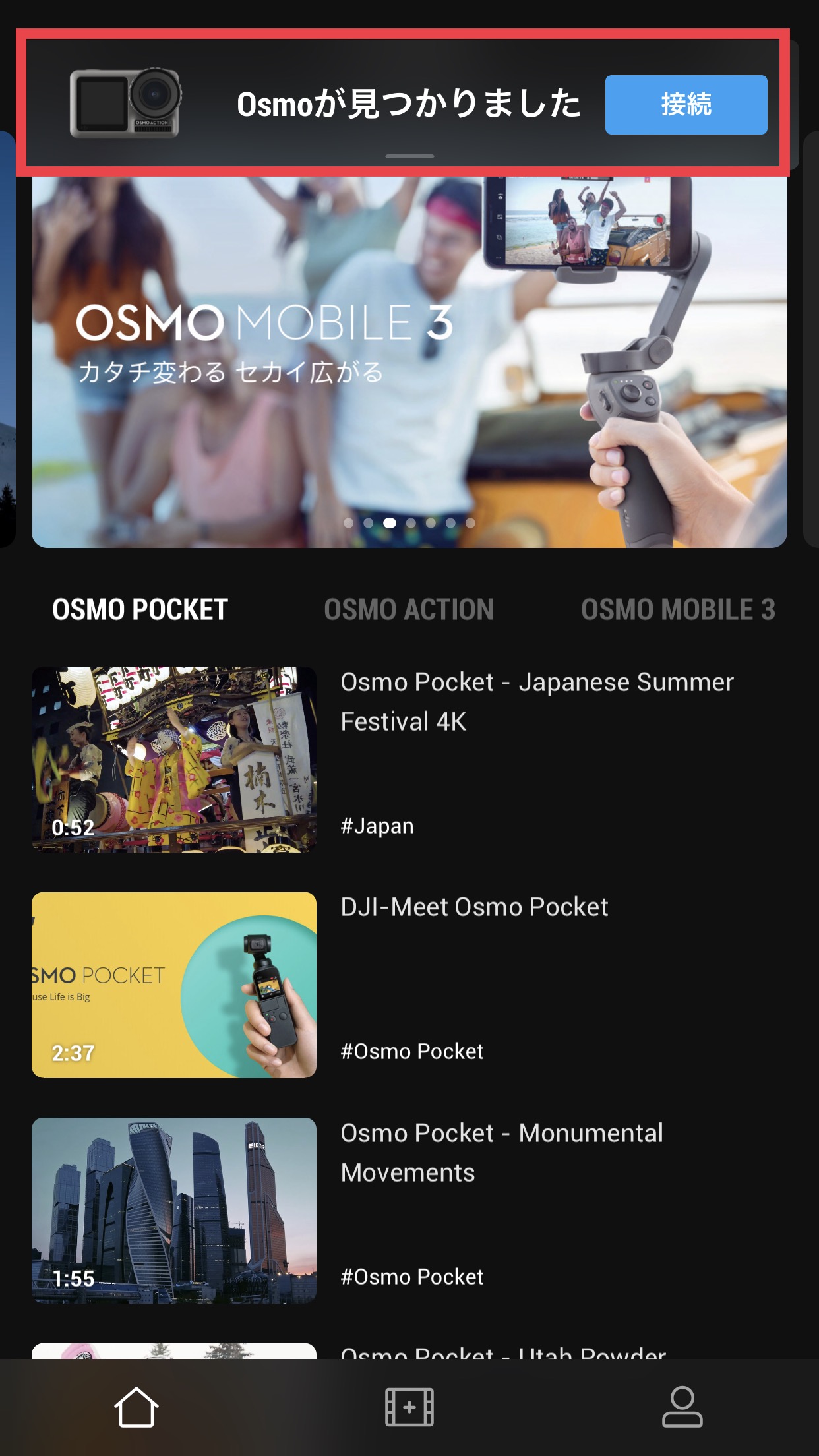 DJI Mimoアプリを開くと上部に「Osmoが見つかりました」と表示されるので「接続」をタップします。