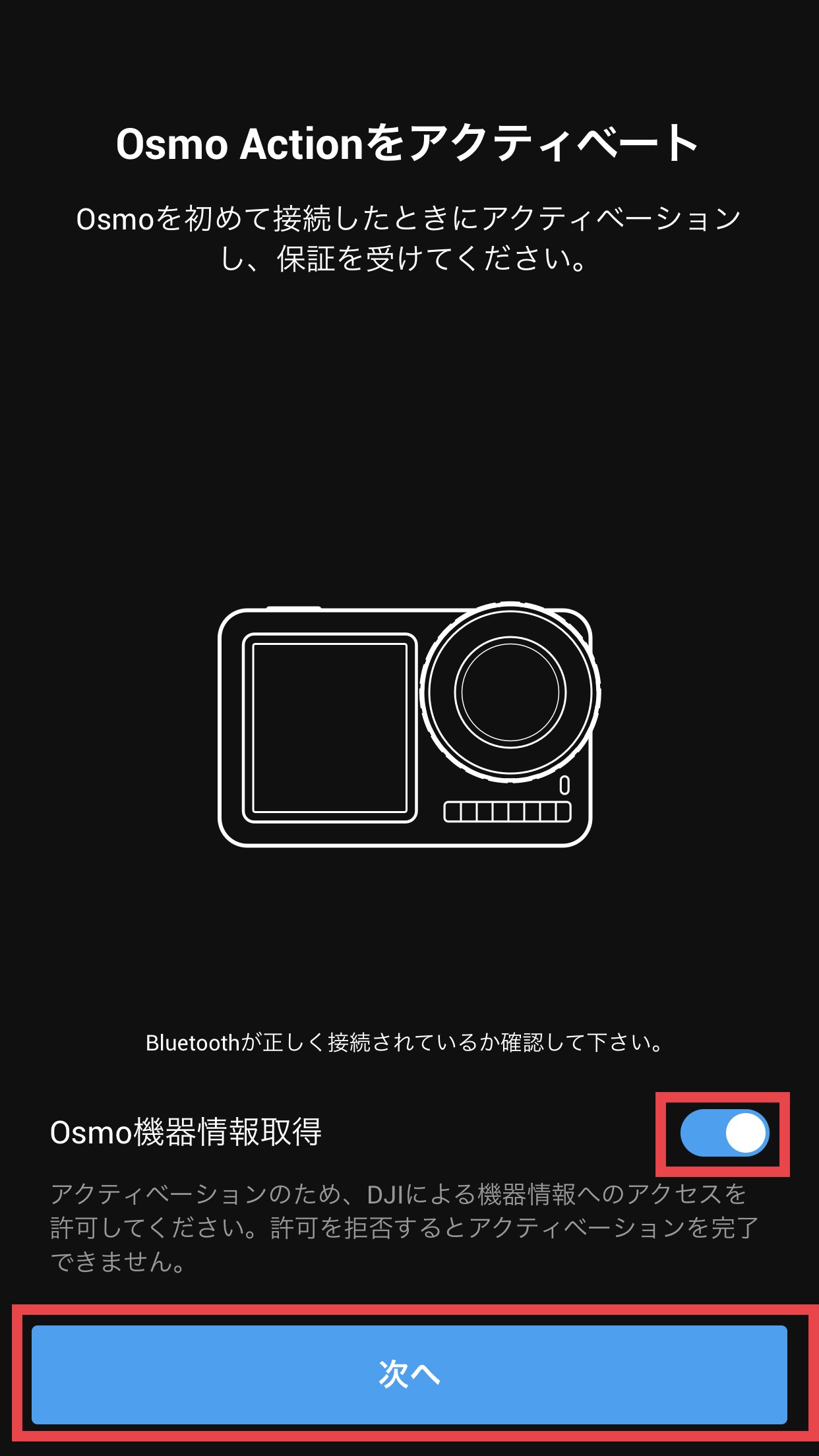 「Osmo Actionをアクティベート」の項目では「Osmo機器情報取得」がオンになっている上で、「次へ」をタップします。