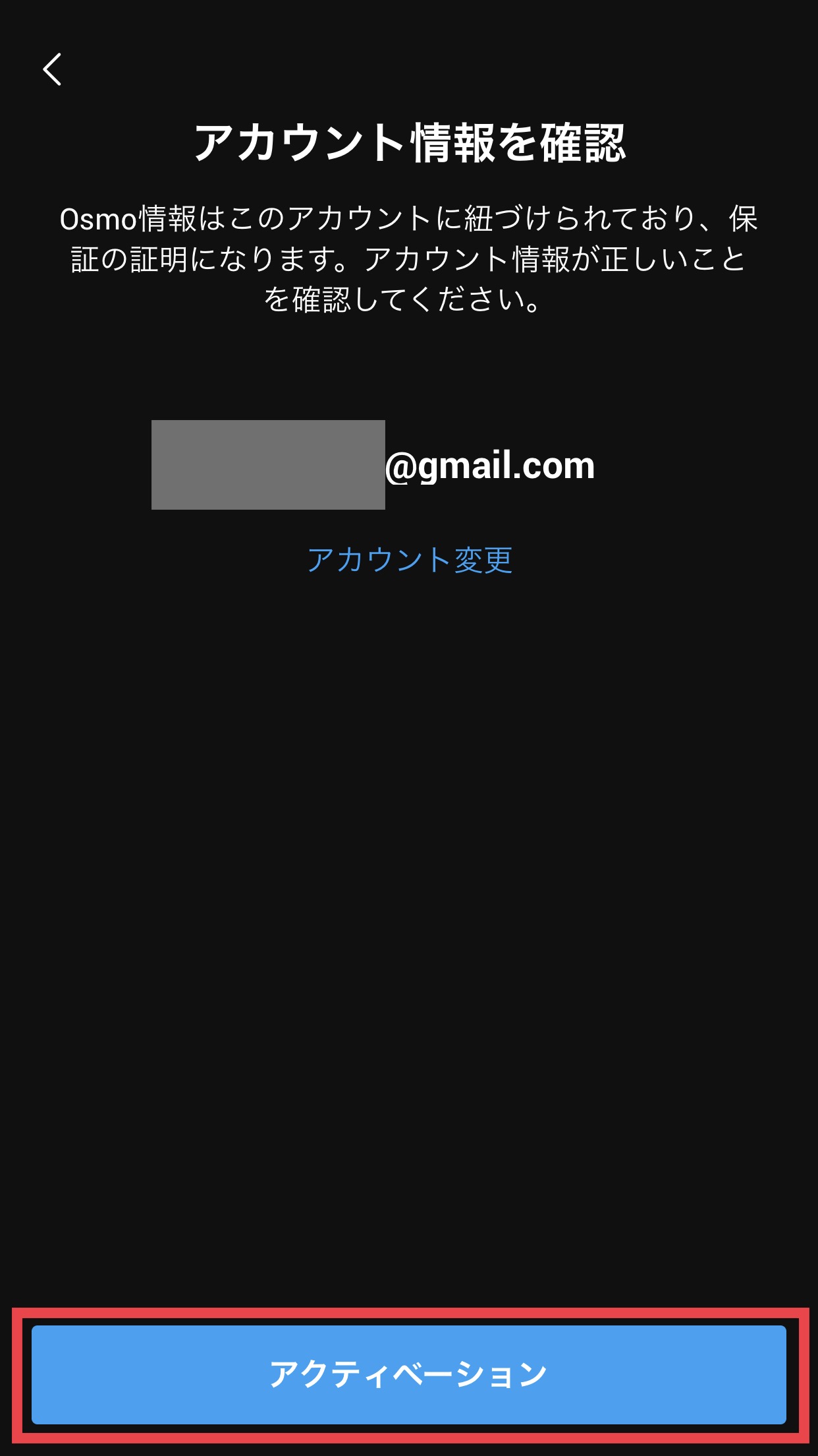 「アカウント情報を確認」で紐づけられているメールアドレスに問題がなければ「アクティベーション」をタップして、アクティベーションを完了させましょう。30秒-1分程度で完了すると思います。