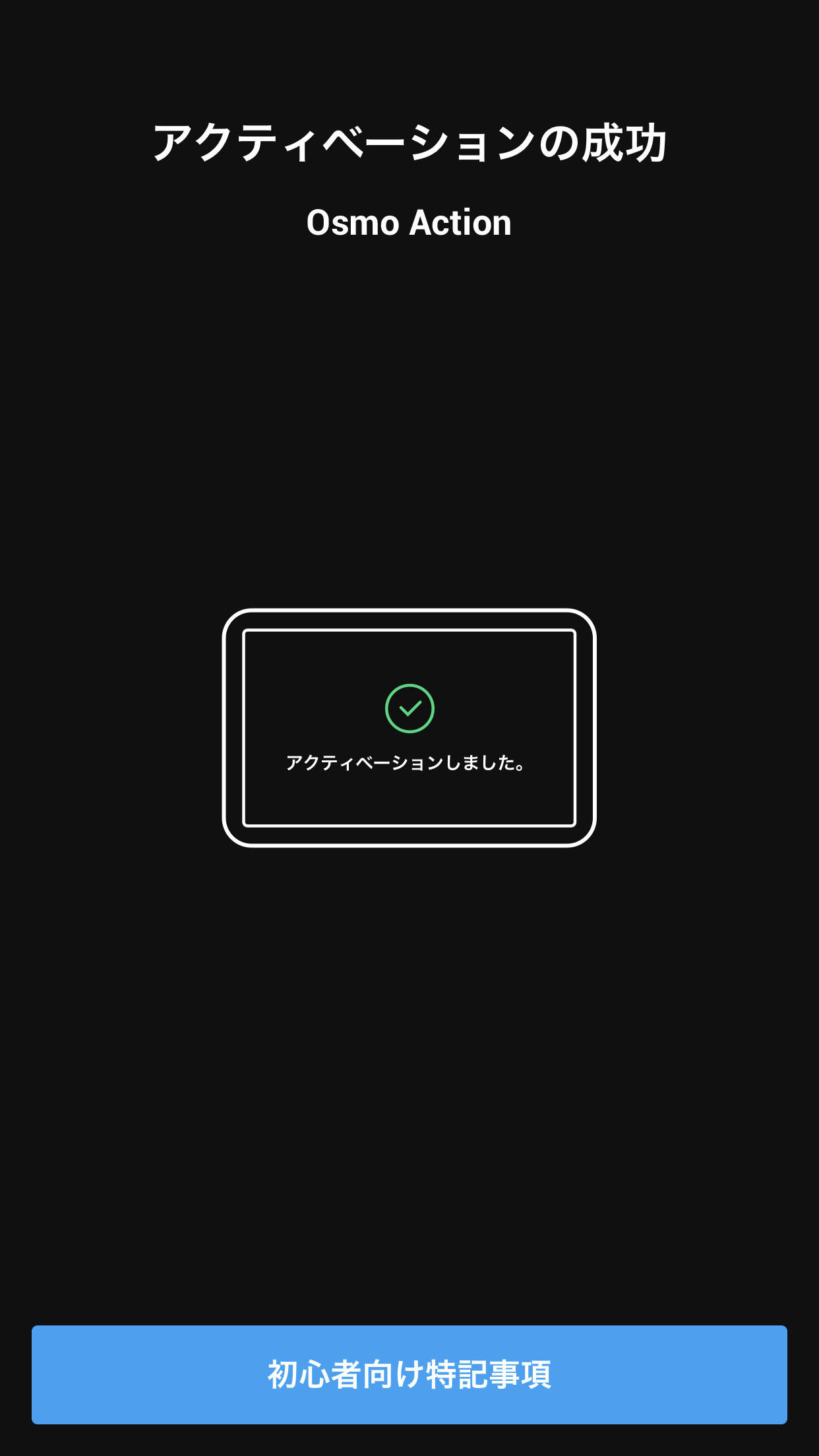 「アクティベーションの成功」と出れば設定完了です。「初心者向け特記事項」をタップすると基本操作のチュートリアルを確認できます。