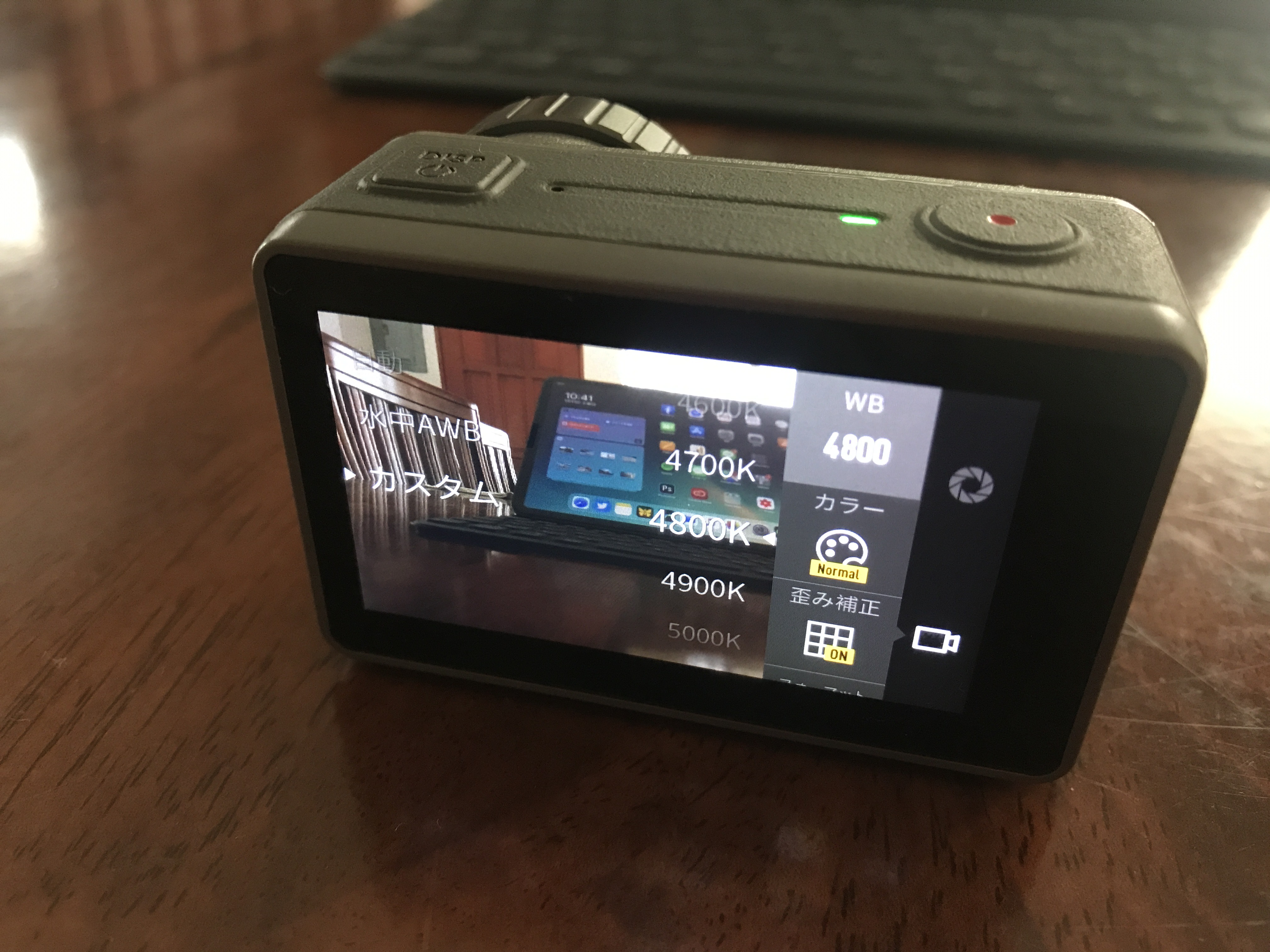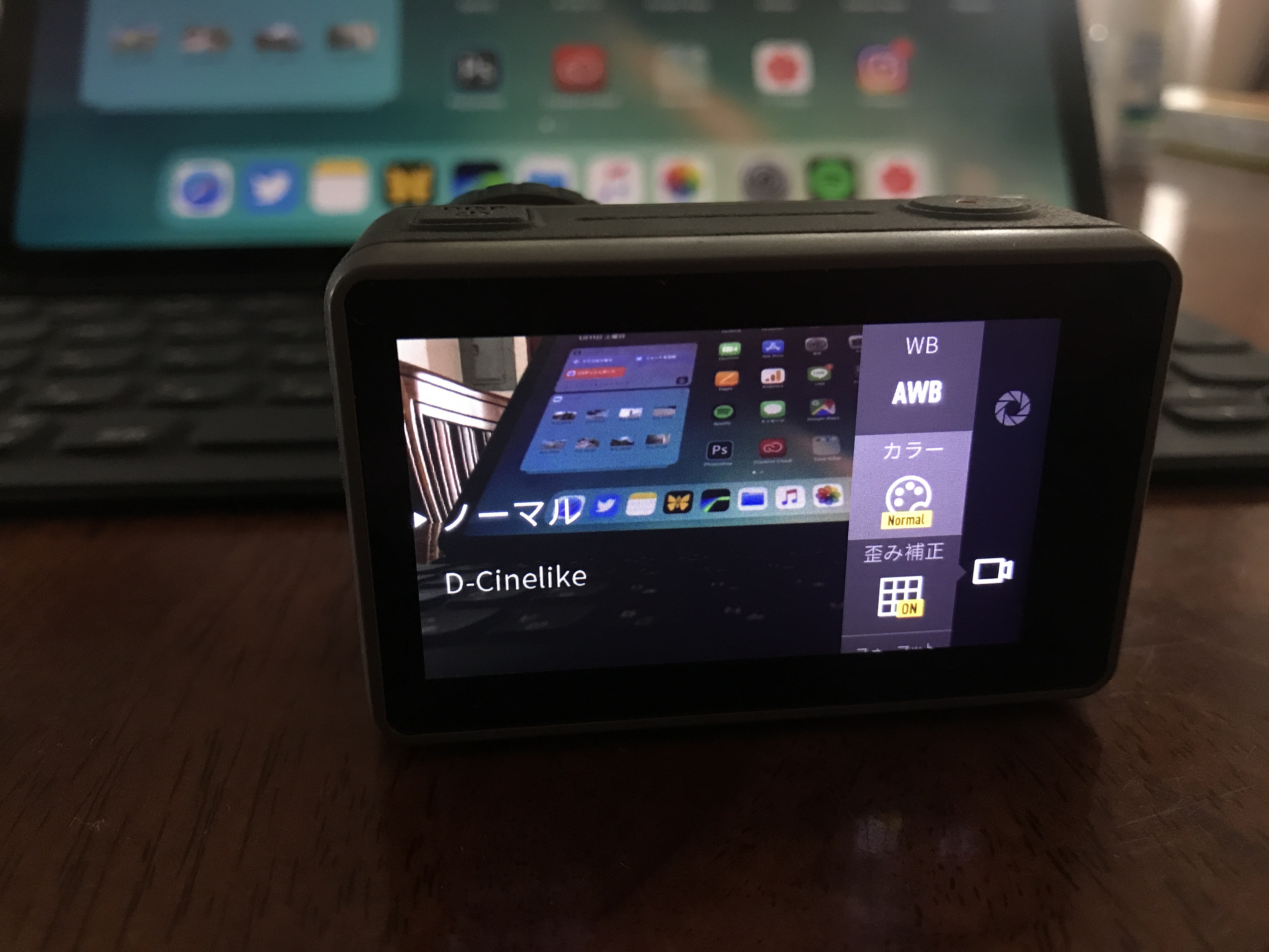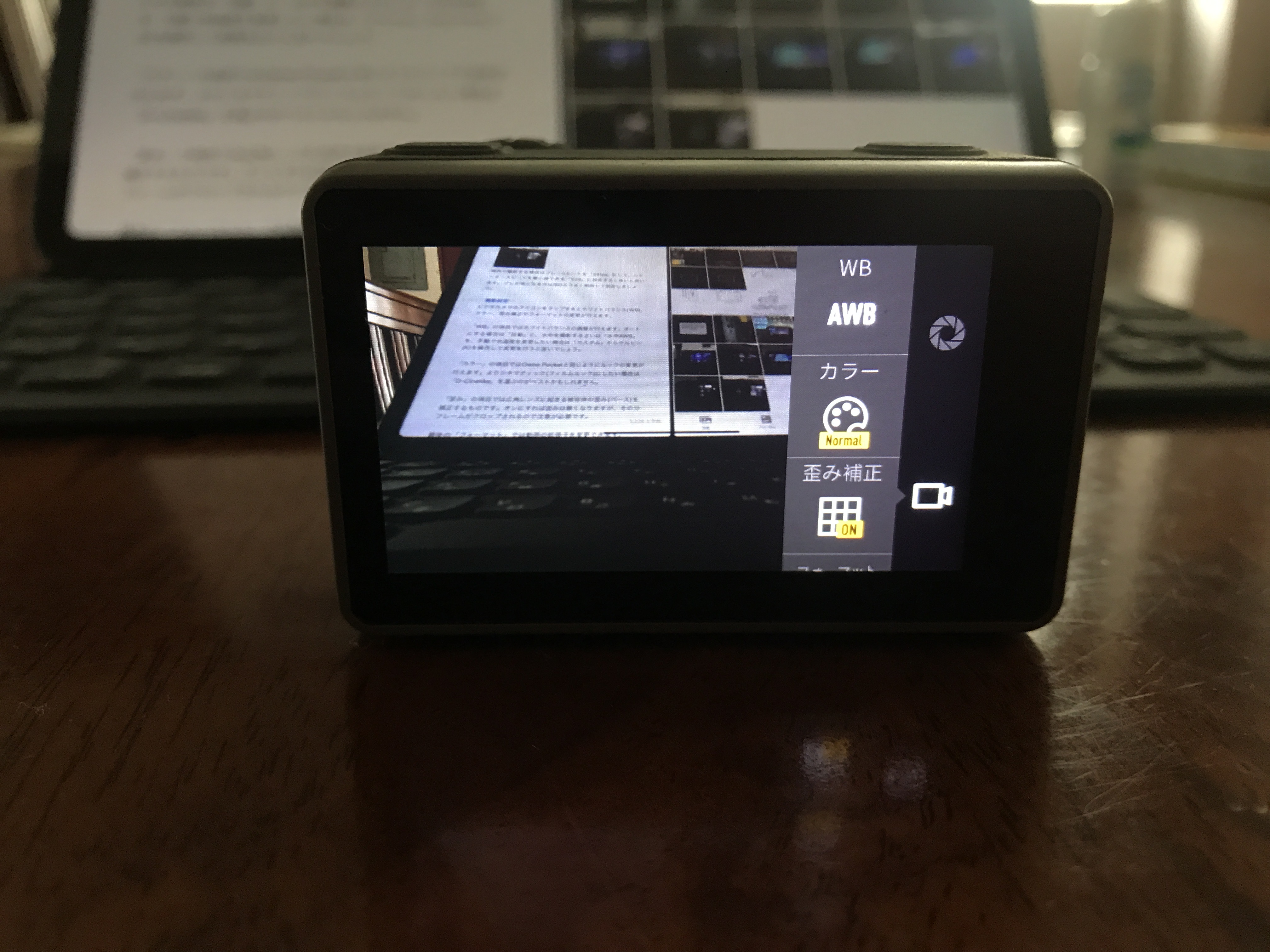 ビデオカメラのアイコンをタップするとホワイトバランス(WB)、カラー、歪み補正やフォーマットの変更が行えます。