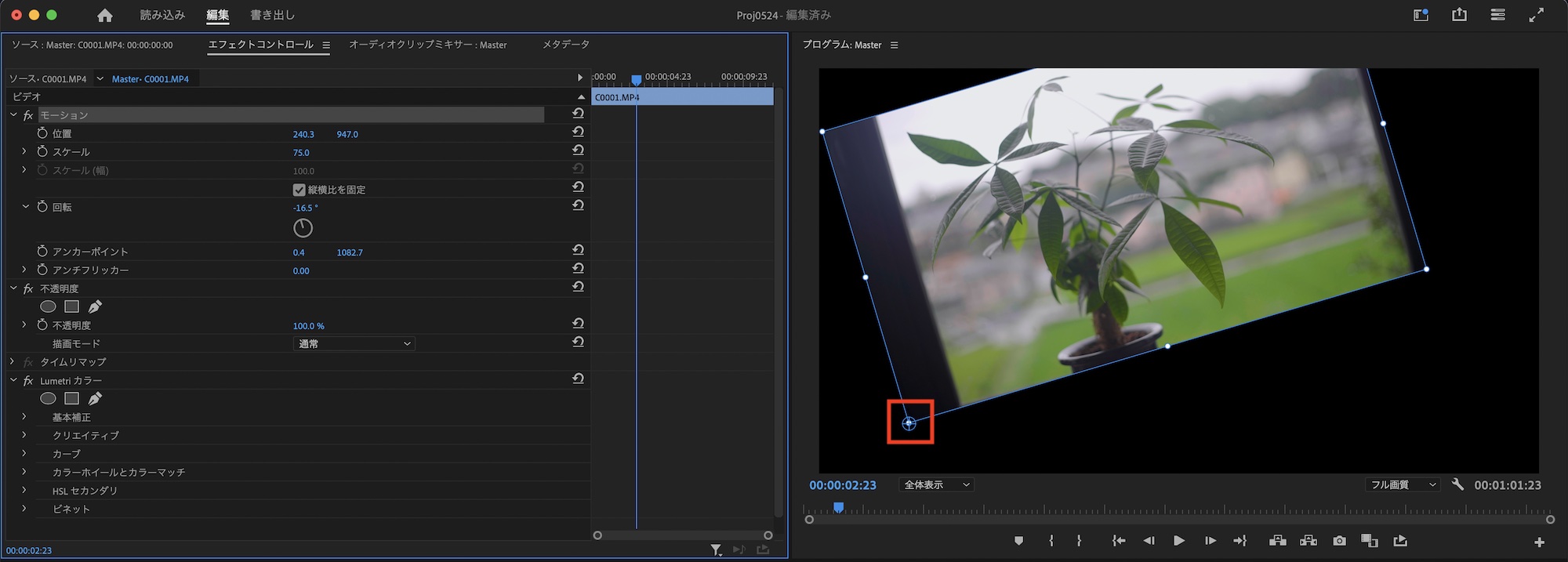 上の画像ではアンカーポイントをクリップの左下に配置することで、回転の効果を変えることが出来ました。