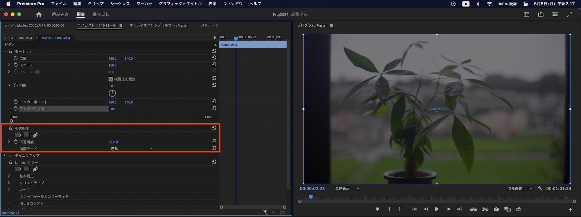 Adobe Premiere Proでクリップの調整を行うにはエフェクトコントロールパネルから操作できます。調整を行うクリップをシーケンス上で選択またはダブルクリックし、エフェクトコントロールパネルを開きます。