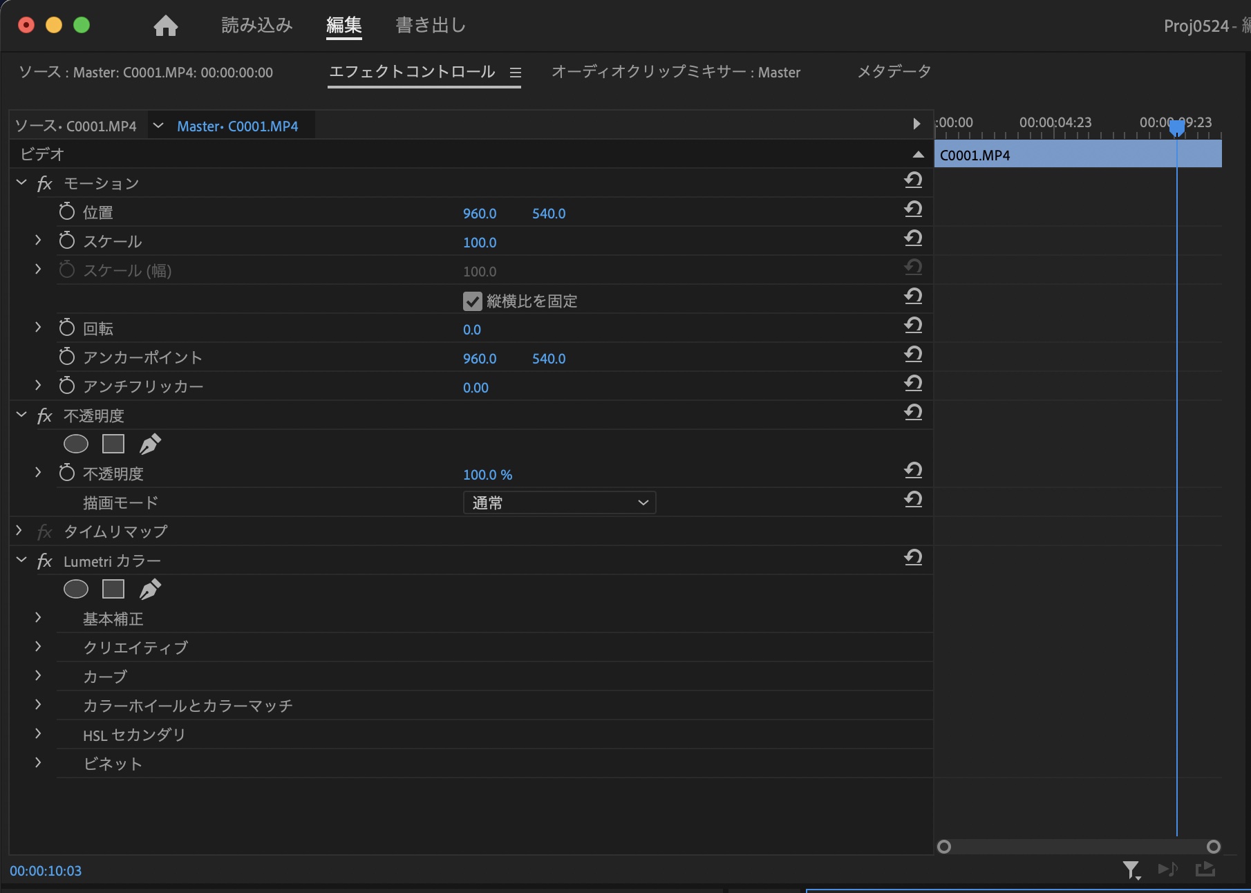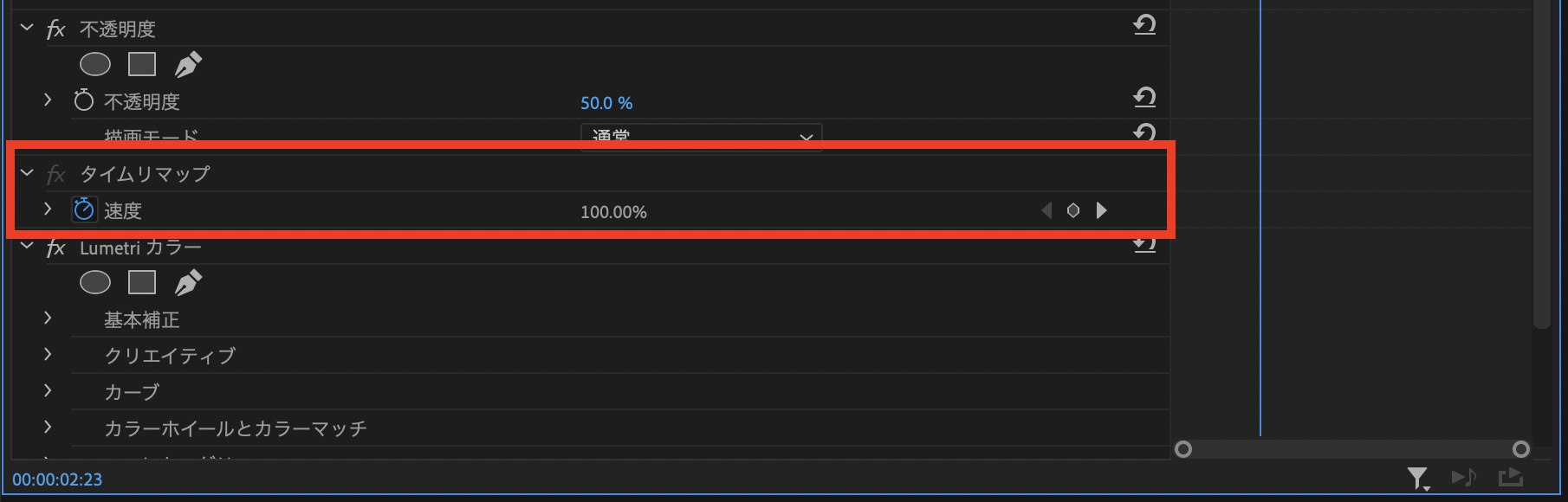 上の例ではLumetriカラーが追加されているので、「Lumetriカラー」のエフェクトが表示されていますが、デフォルトでは「モーション」、「不透明度」、「タイムリマップ」が表示されています。