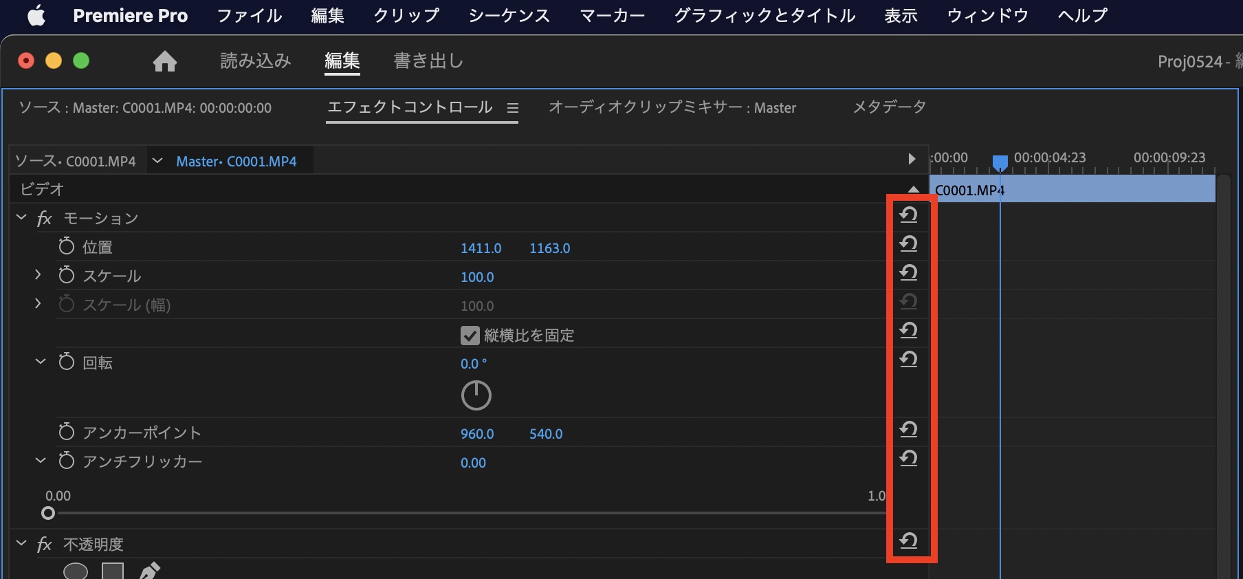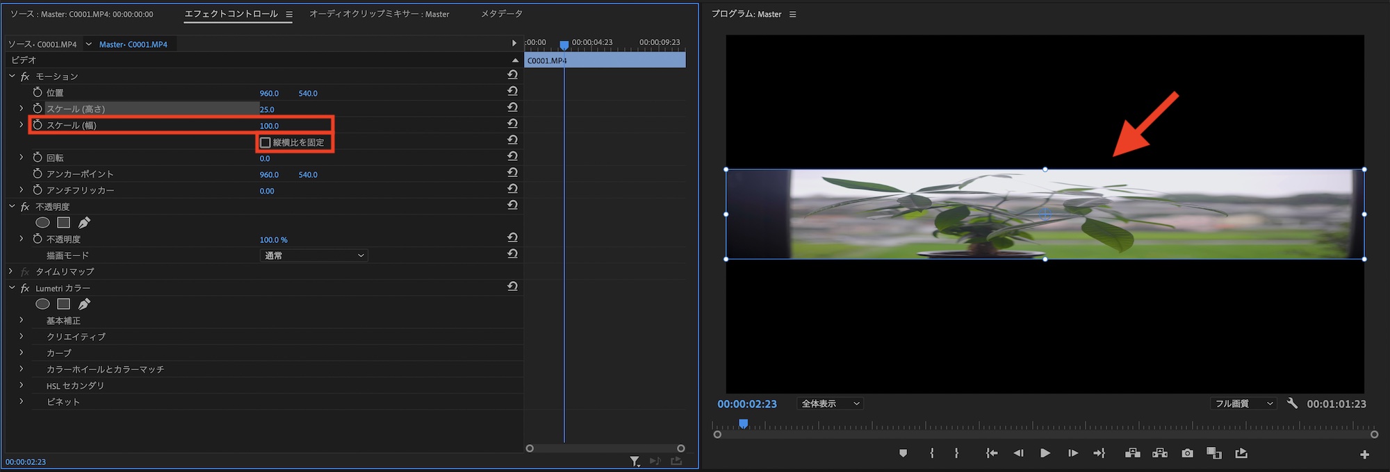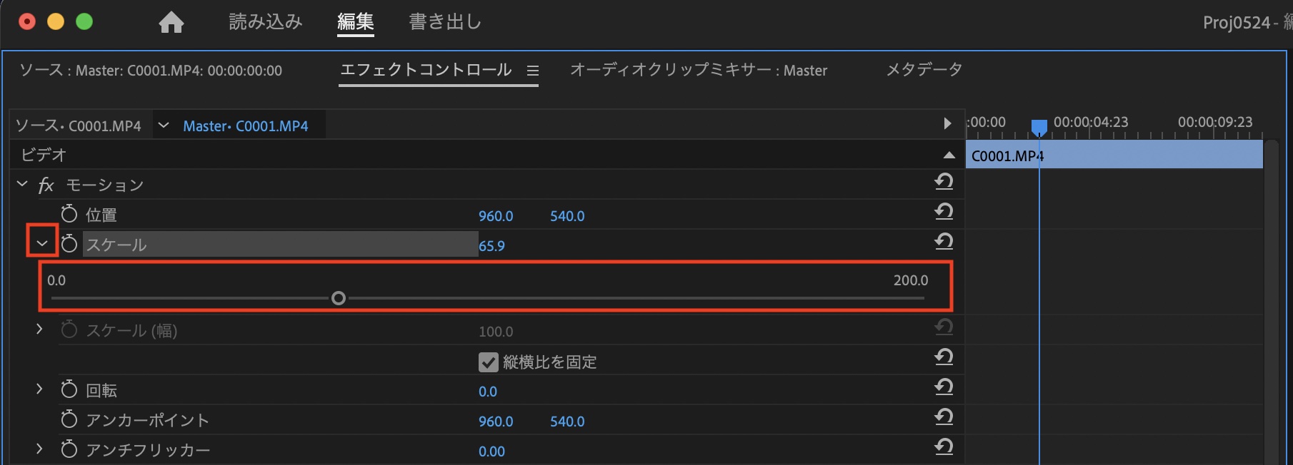 エフェクトコントロールパネルではその名の通り、クリップに追加されたエフェクトや今回紹介するスケールや位置などのパラメータなどが表示されています。