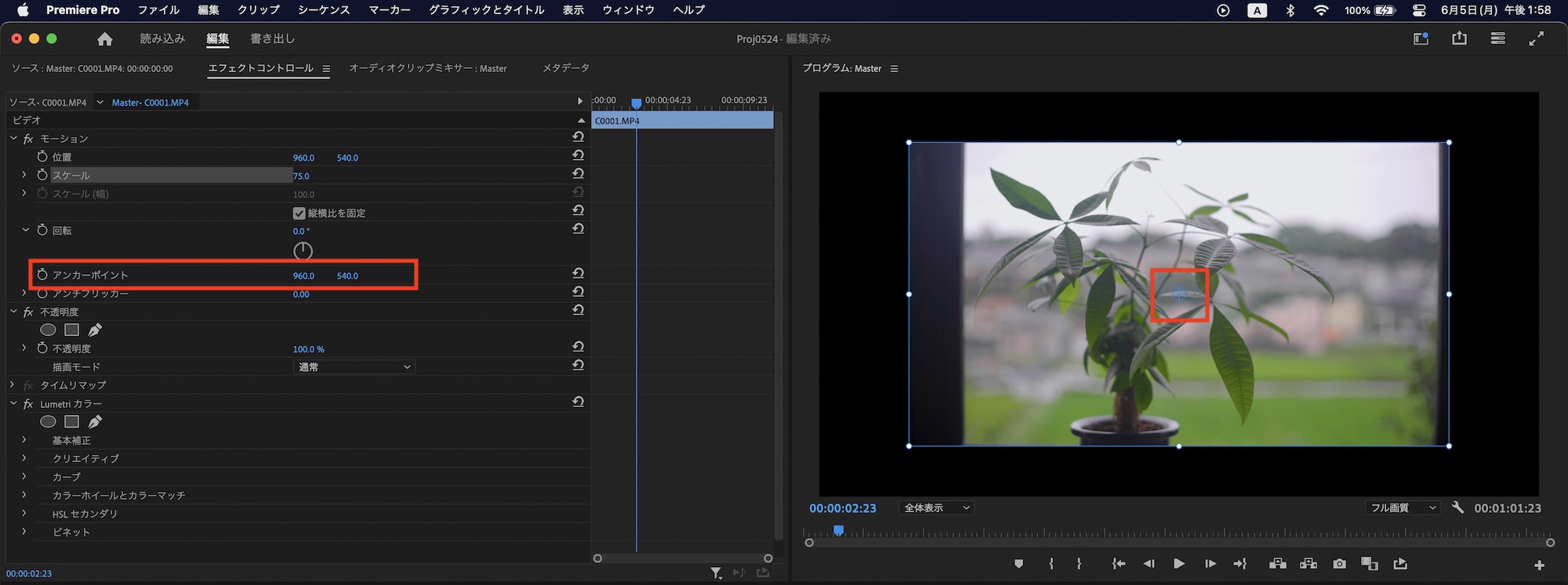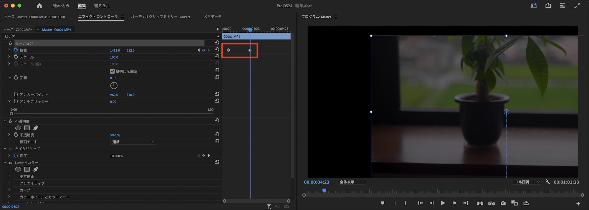 モーションでは「位置」、「スケール」、「回転」、「アンカーポイント」、「アンチフリッカー」のパラメータが用意されており、パラメータの数値を変更することで調整ができるほか、いずれかのパラメータ名を選択するとプログラムモニターで直接調整できます。