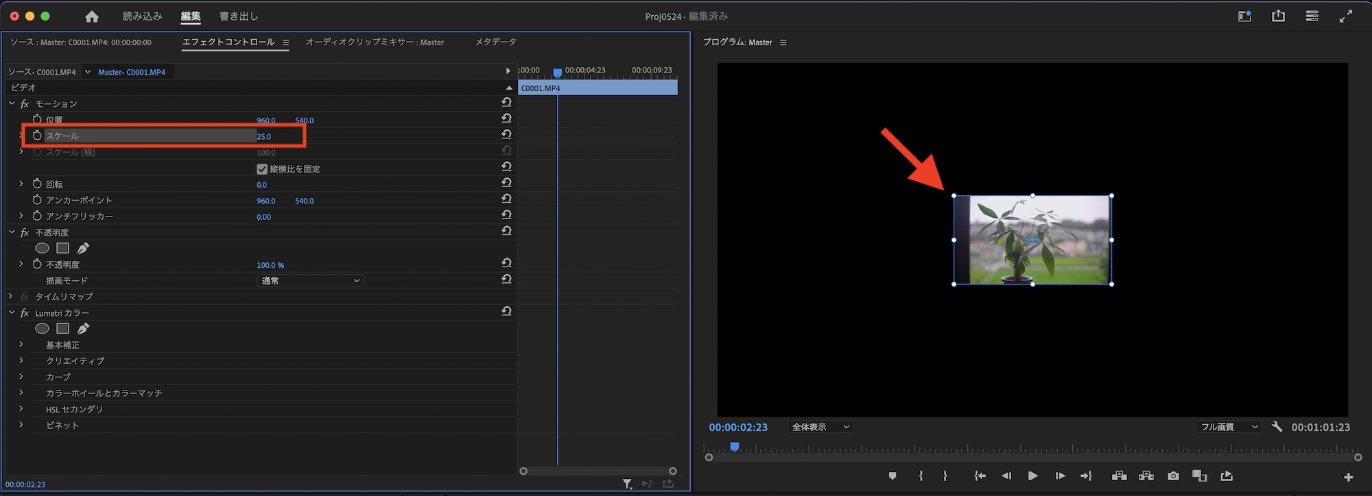 「スケール」はクリップの縮小・拡大を操作できます。デフォルトは「100%」となっており、「25」に変更すると25%小さくなります。