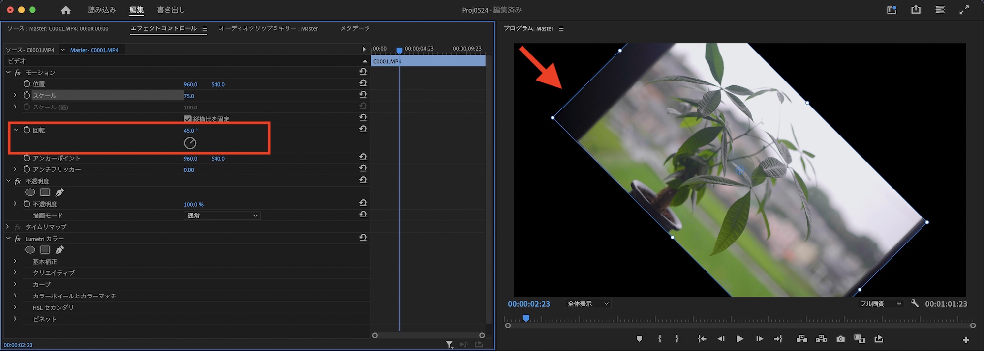 「回転」の項目でクリップを回転できます。「45°」にすると時計回り、「-45°」にすると反時計回りで回転できます。三角アイコンをクリックしてコントローラーから調整することも可能です。