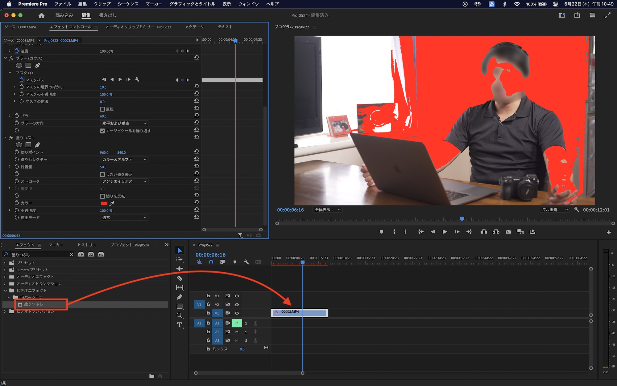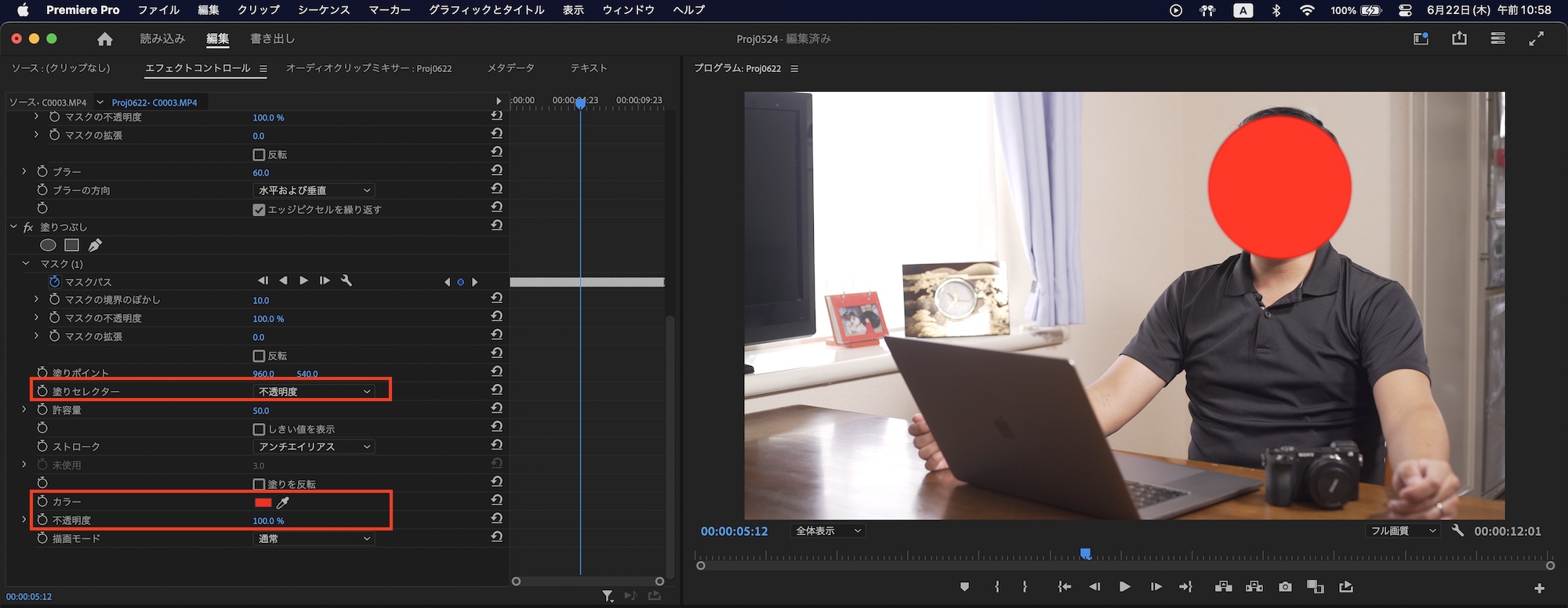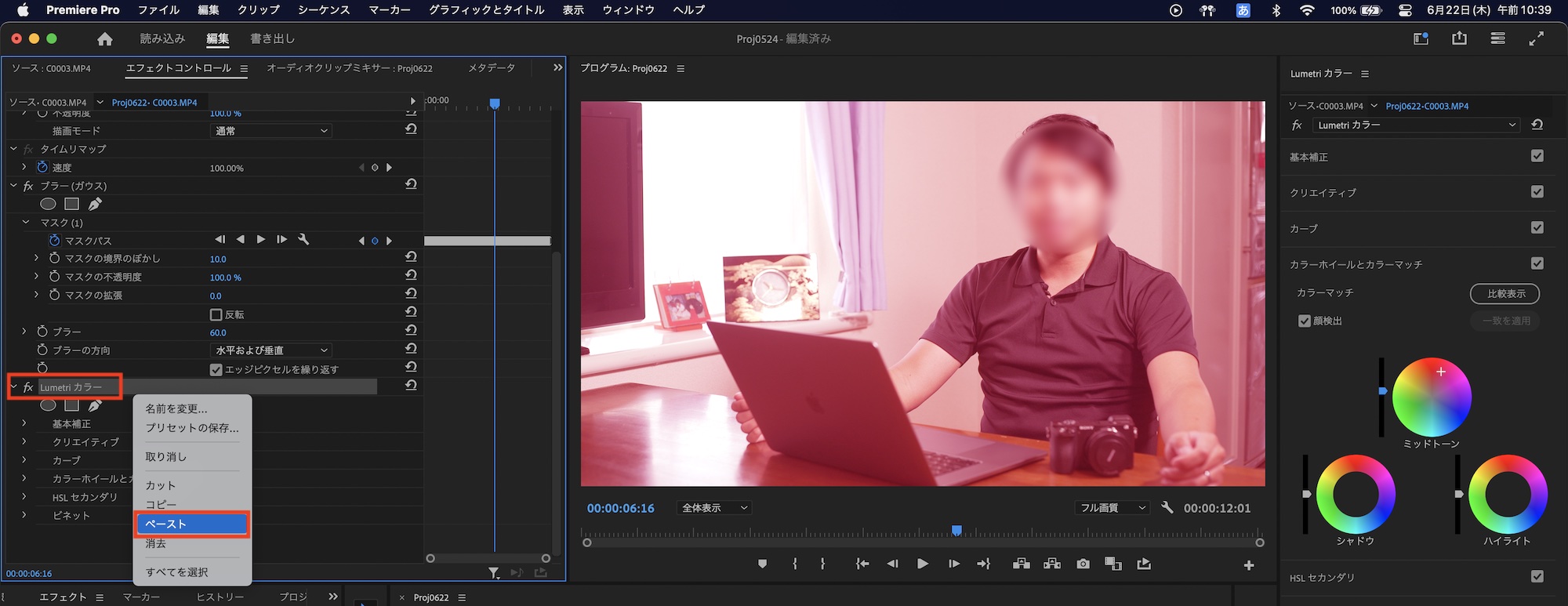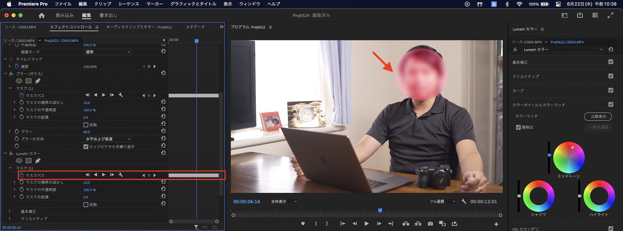 トラッキングを再解析する場合は、Lumetriカラーに追加してるマスクを一度削除し、ブラーのマスクをトラッキングを解析した後で、マスクをコピーしLumetriカラーにペーストすると良いでしょう。