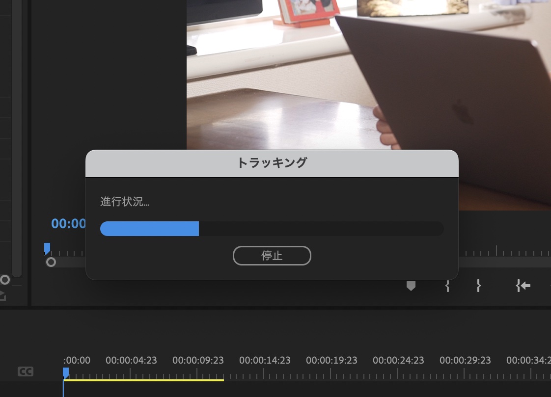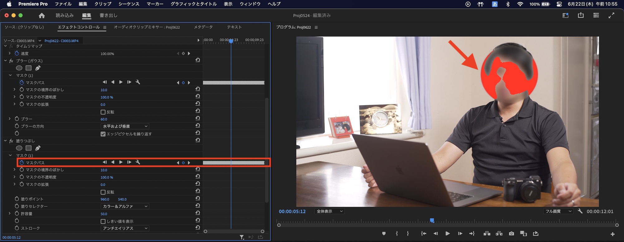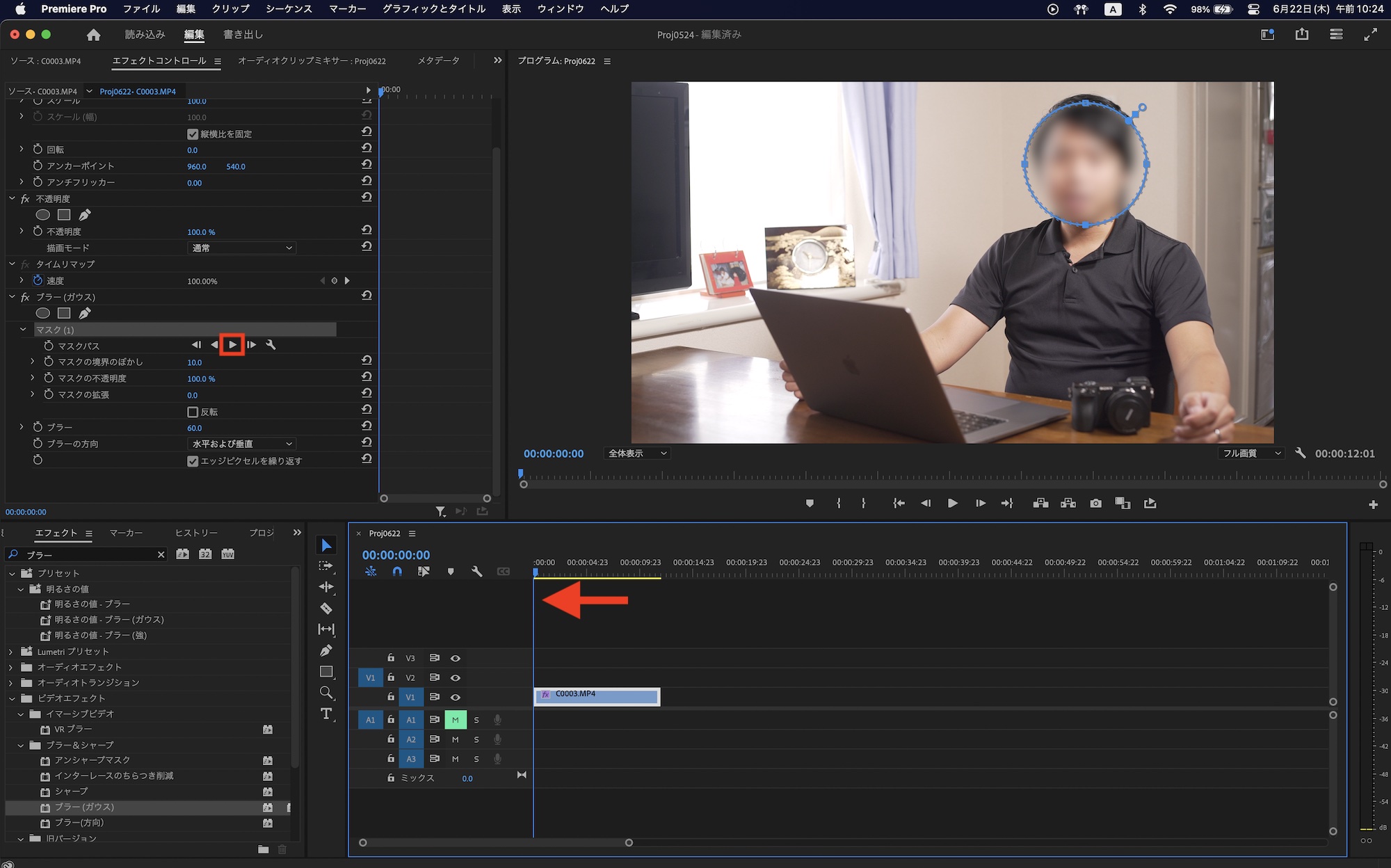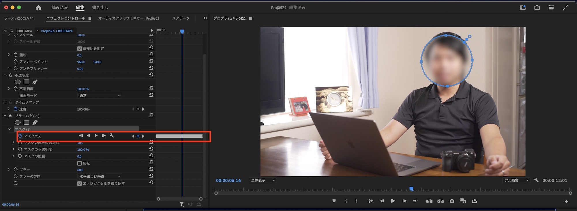 再生ヘッドをクリップの最初のフレームなどに動かし、「マスク(1)」の中にある「マスクパス」の再生アイコンをクリックしてトラッキングを行います。