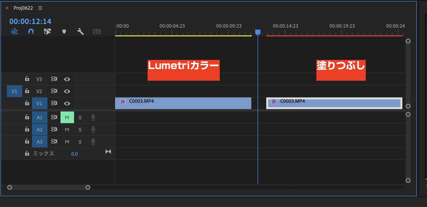 Lumetriカラー、塗りつぶしどちらを使ってもほぼ同じような感じになりますが、シーケンスのレンダリングバーを確認してみるとLumertiカラーは黄色になっているのに対し、塗りつぶしは赤色になっています。