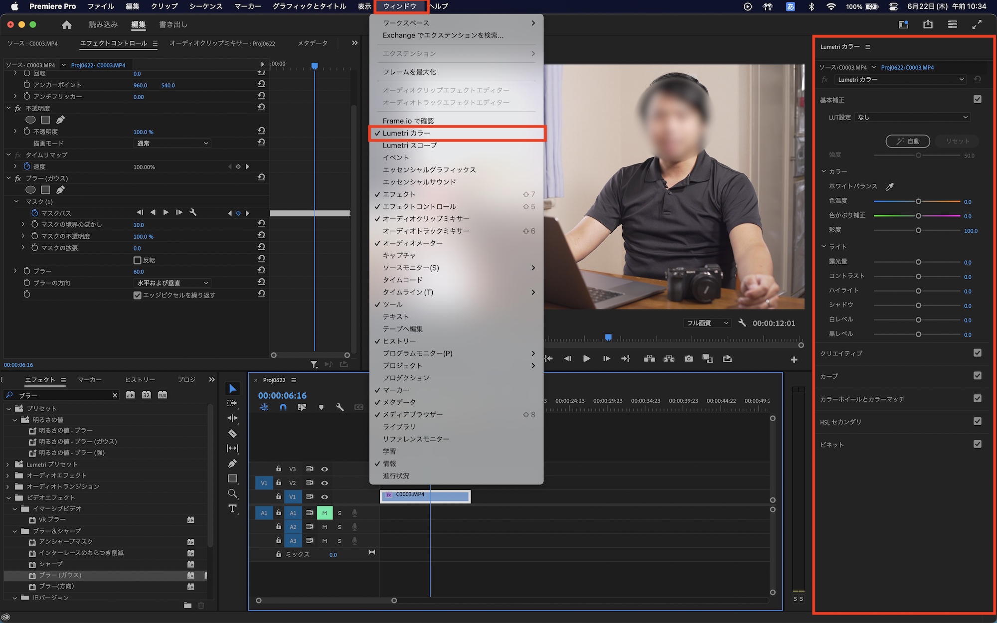 作成したブラーにはまだ色が追加されていないので、Lumetriカラーをクリップに追加します。エフェクトパネルから追加することもできますが、Lumetriカラーパネルを表示させるだけでも問題ありません。