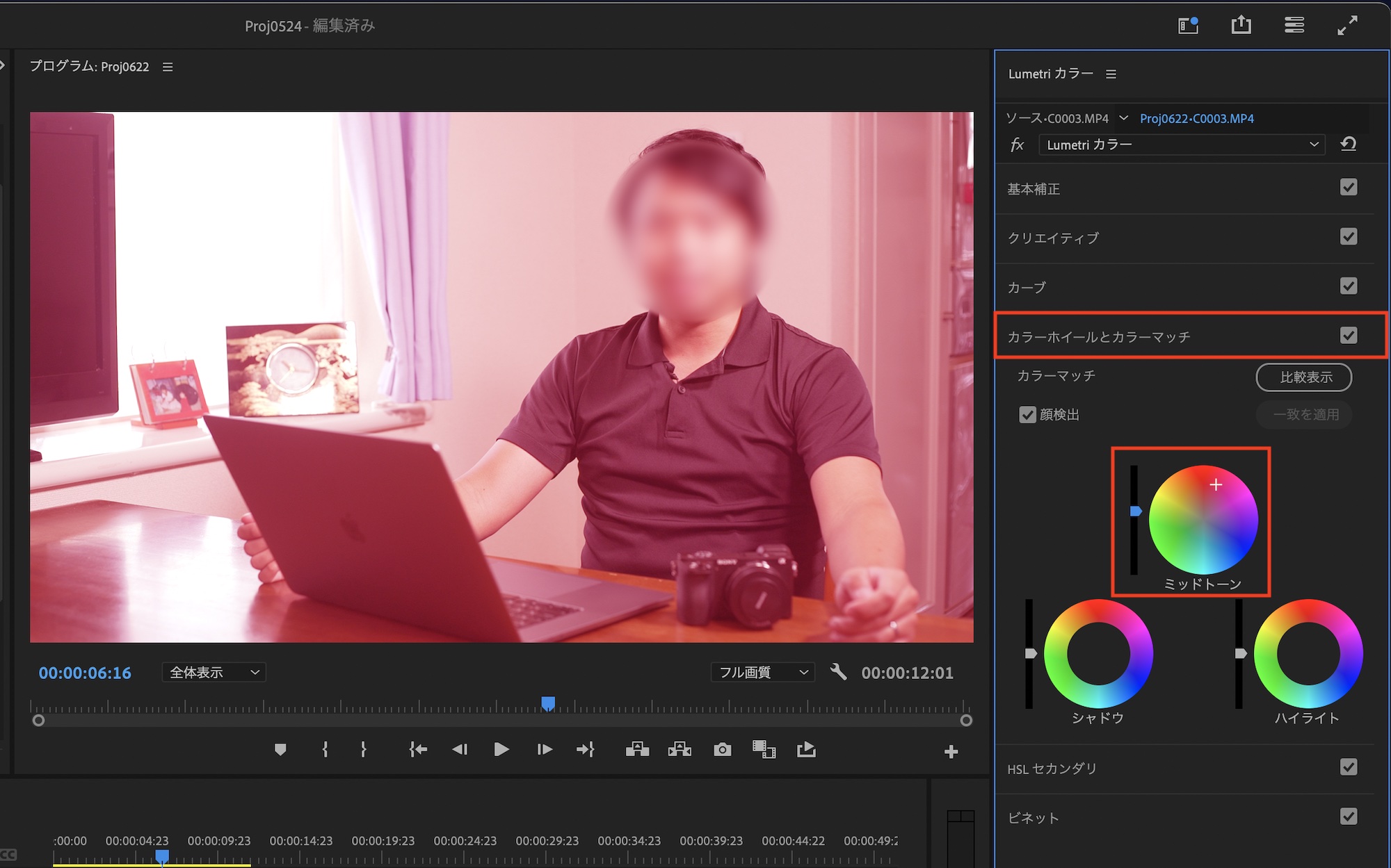 Lumetriカラーの「カラーホイールとカラーマッチ」の項目に移り、「ミッドトーン」のホイールを使ってモザイクの色を追加します。今回はわかりやすくピンクに近い赤色にしてみます。