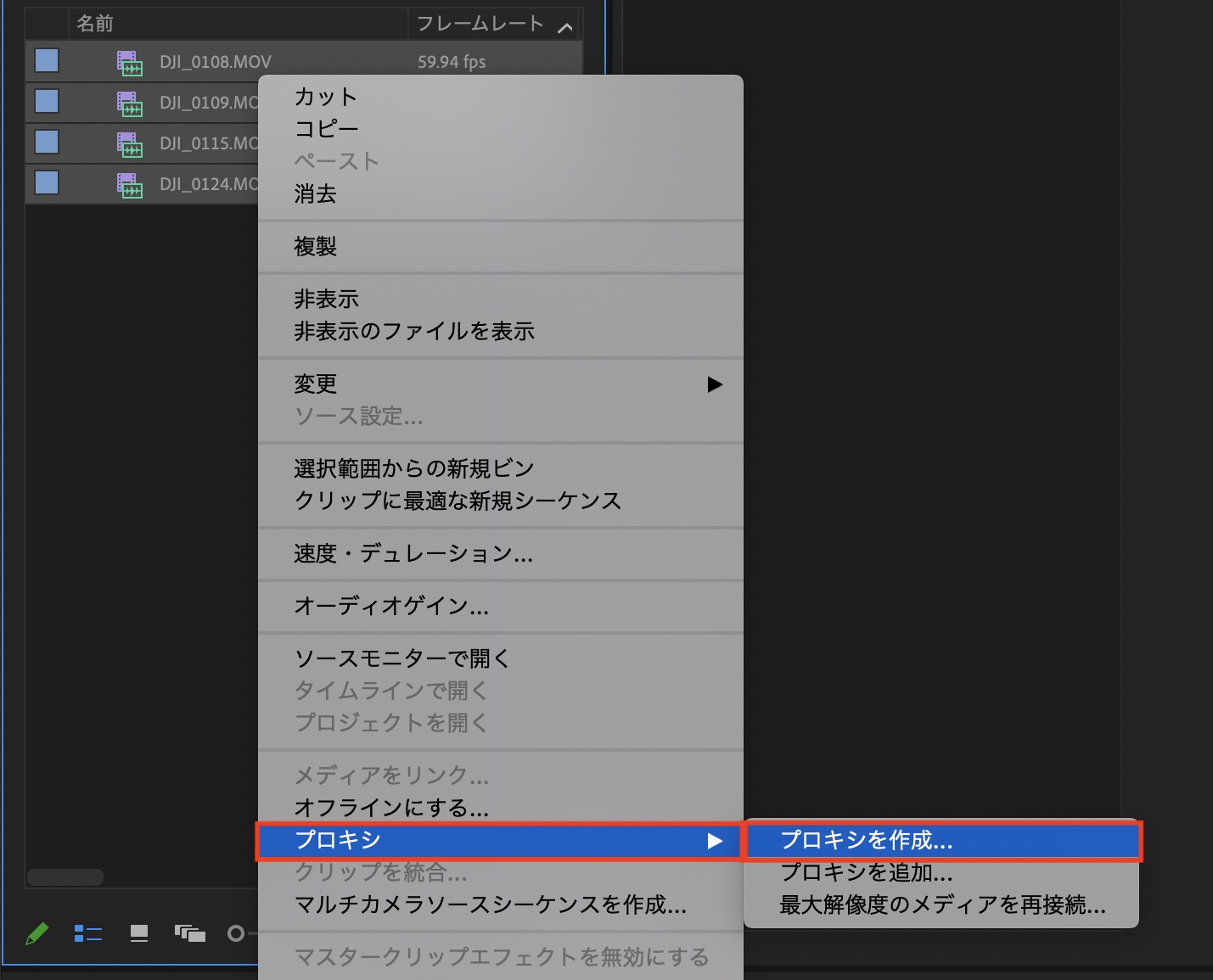 そんな時に役に立つのが元の素材を「Proxy(プロキシ)」に変換するという方法です。