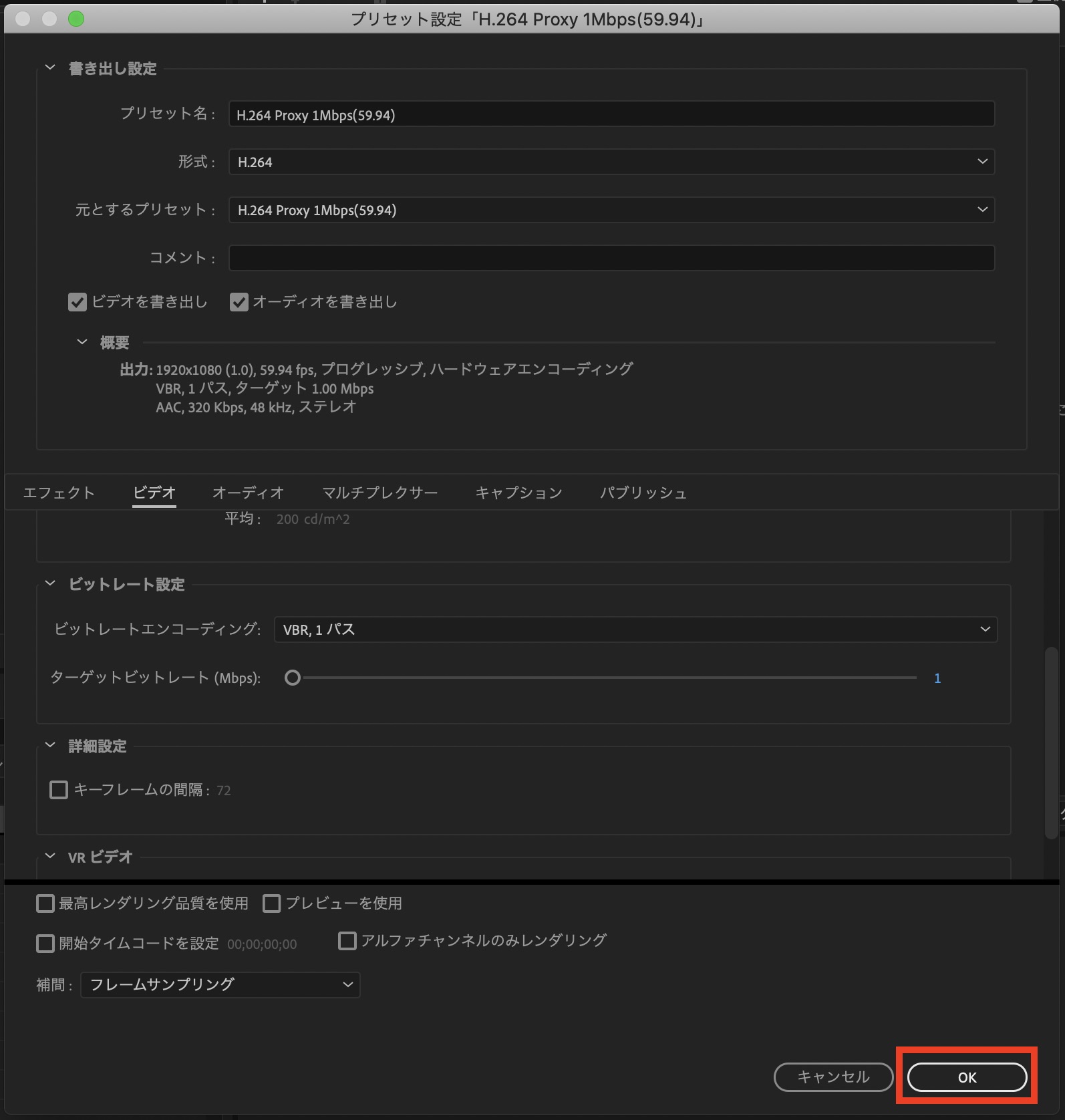 「OK」をクリックしてエンコーディングプリセットの作成を完了させます。今回の例では「H.264/59.94fps/1Mbps」の設定にしてみました。