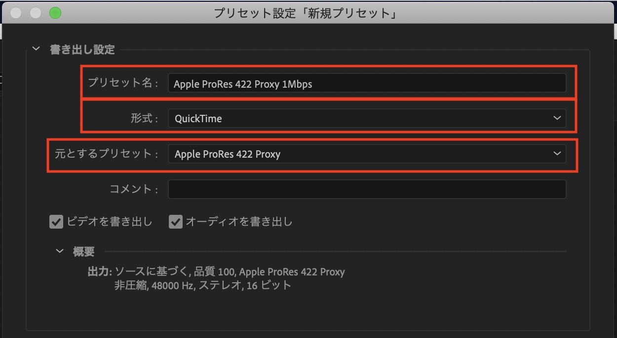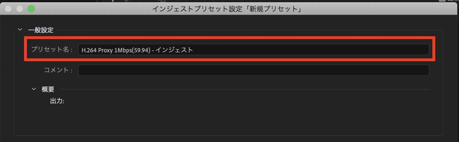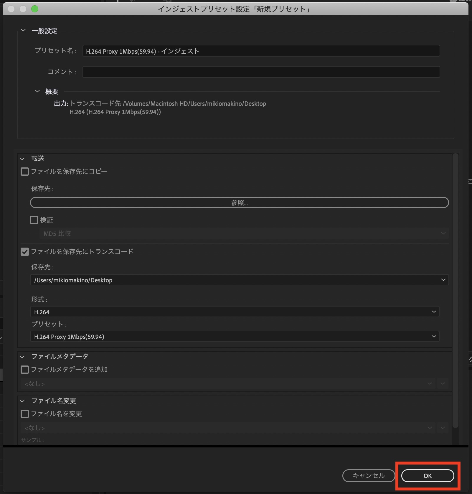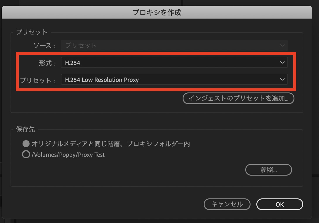 プリセット名は先程の設定で使った名前の後に「- インジェスト」と加えると分かりやすくなります(例: H.264 Proxy 1Mbps(59.94) - インジェスト)。