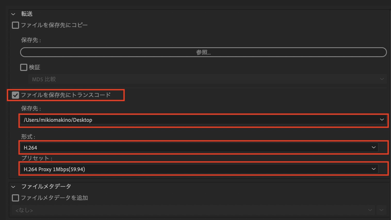 「ファイルを保存先にトランスコード」にチェックを入れ、「保存先」を好きなフォルダに指定します。保存先はPremiere Proで指定できるので、どのフォルダでも構いません。指定しないとエラーが起きる可能性があります。