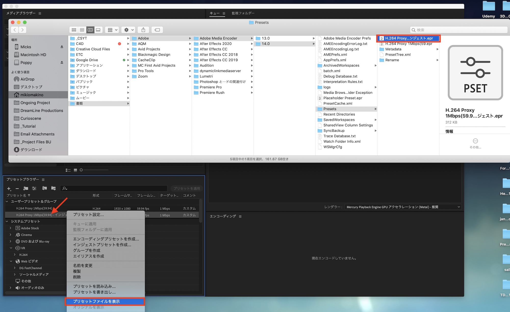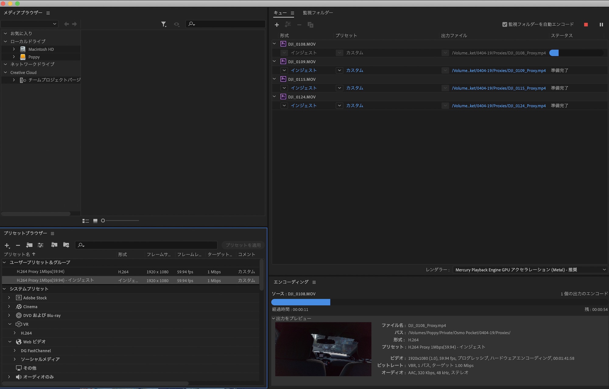 初めてプロキシに変換する場合はデフォルトのH.264またはQuickTimeのプリセットで作成されます。より細かくビットレートやコーデック、解像度の調整を行いたい方は変換前にインジェストプリセット(.epr)を作成する必要があります。