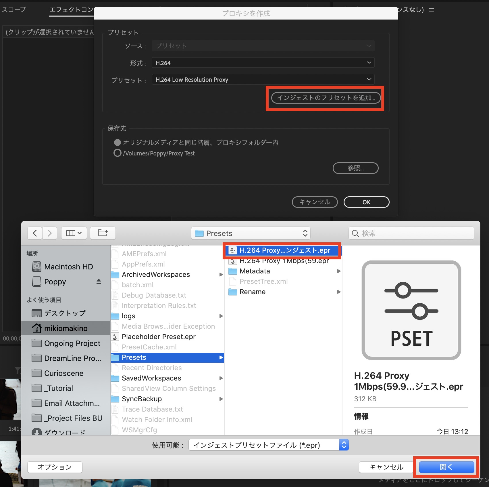 その後で「プロキシを作成」を選び、「インジェストのプリセット」ボタンから作成したインジェストプリセット(.epr)を読み込みましょう。すでに読み込まれている場合はプリセット一覧から設定します。