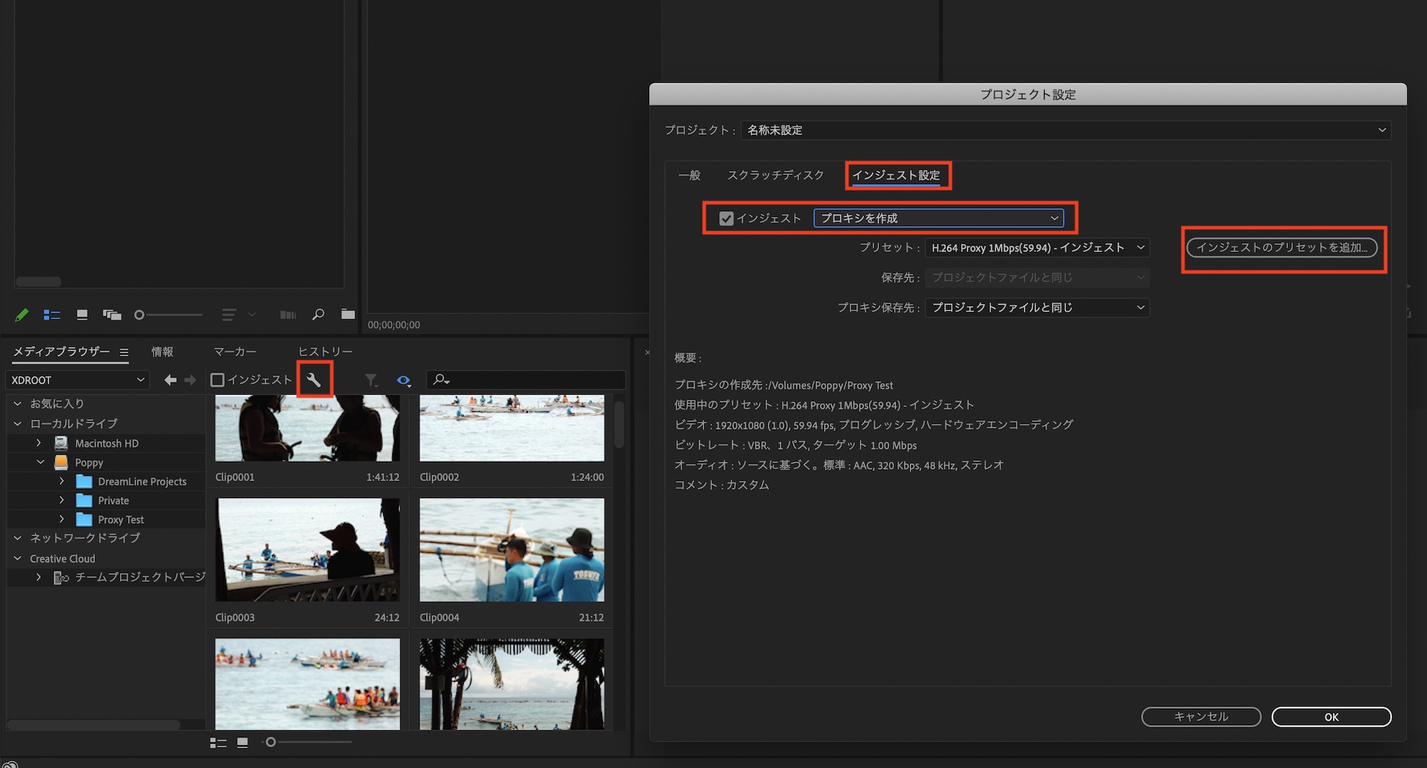 素材がすでにプロジェクトウィンドウにある場合は右クリック「プロキシ」から「プロキシを作成」を選び、「インジェストのプリセット」ボタンから作成したインジェストプリセット(.epr)を読み込みましょう。