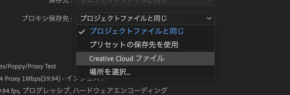 保存先を「プロジェクトファイルと同じ」を選ぶと上の項目と同じように「Proxy」ファイルに保存されますが、この画面からであればCreative Cloudドライブに保存するオプションが用意されているため、チームで作業する時にも便利です。