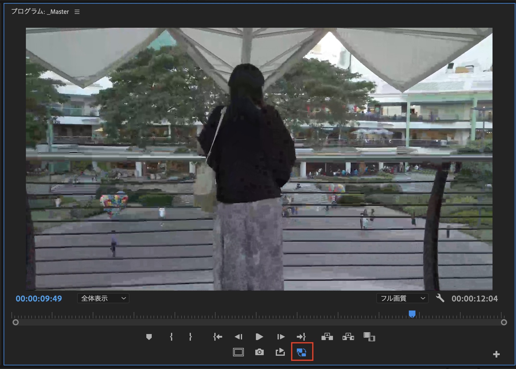 プロジェクトウィンドウからシーケンスに追加されると元素材の設定が反映されるものの、ソースまたはプログラムウィンドウにある「プロキシの切り替え」を使ってプロキシ素材を使うことが出来ます。青く表示されている時はプロキシを使っている状態になります。