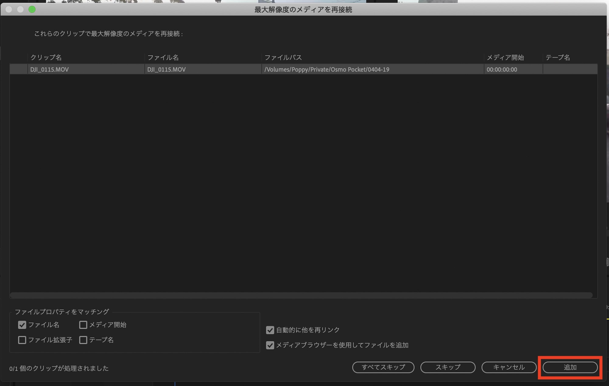 作成したプロキシ素材がPremiere Proで上手くリンクされていない場合は対象のクリップを右クリックして「プロキシ」から「最大解像度のメディアを再接続」を選択して「追加」から元素材のファイルを選びましょう。