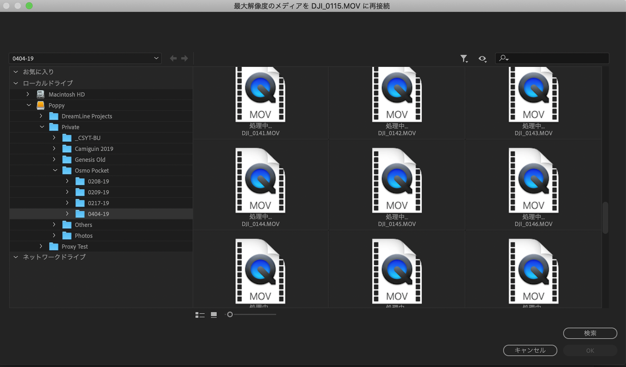 eprファイルは前の項目で確認した保存先から読み込めば問題ありません。「OK」をクリックすると元素材が保存されている場所に「Proxies」というフォルダが作成され、プロキシ素材が保存されます。
