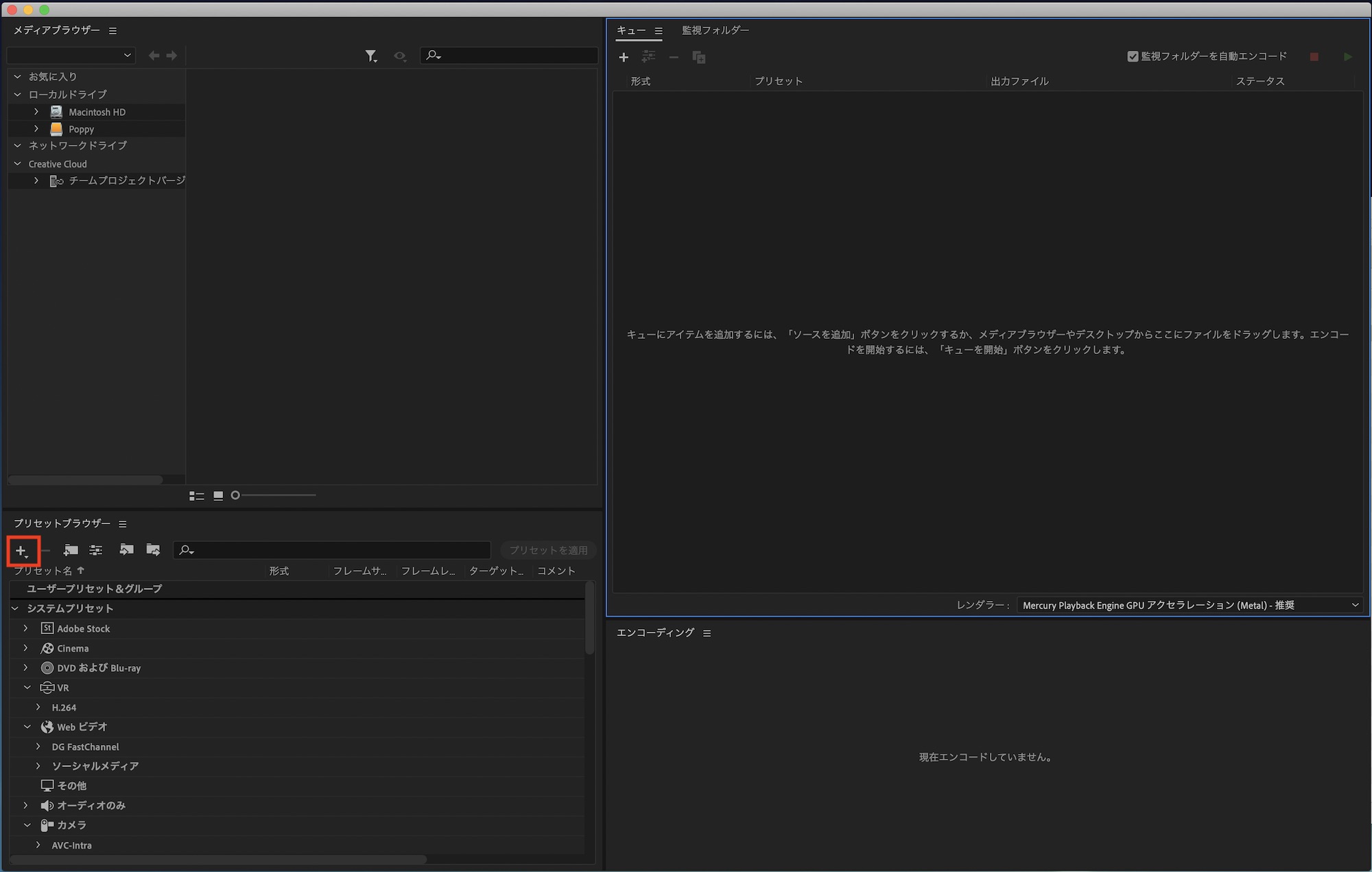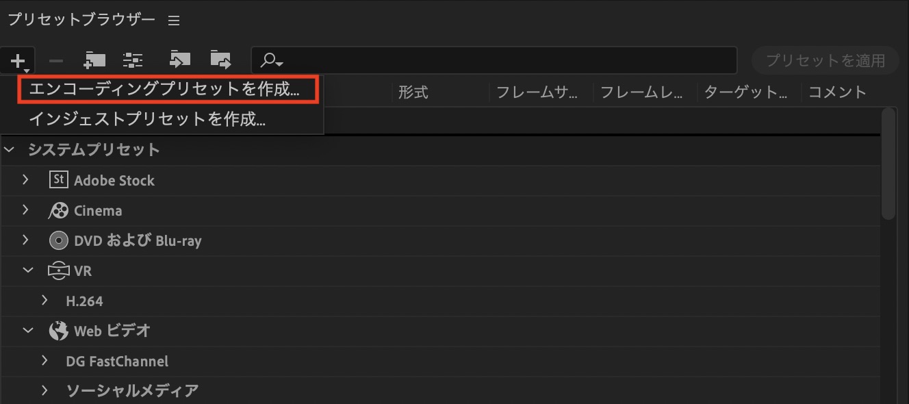 Adobe Media Encoderを開き、「プリセットブラウザー」タブの「+」にある三角アイコンをクリックして「エンコーディングプリセットを作成」をクリックします。エンコーディングプリセット無しではインジェストプリセットが作れないので、先にこちらを追加しましょう。