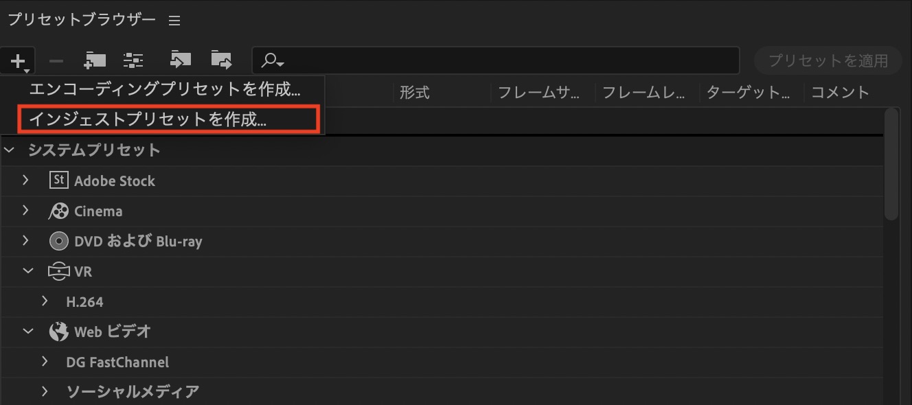 先程と同じようにプリセットブラウザの「+」アイコンにある三角アイコンをクリックして「インジェストプリセットを作成」を選択します。