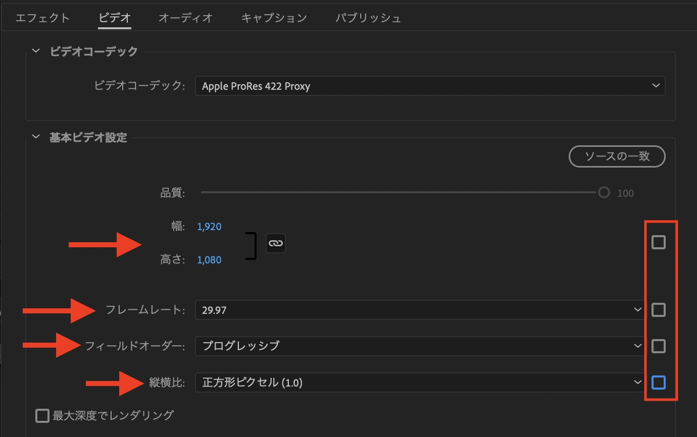 次に「基本ビデオ設定」の項目のチェックを外し、元素材に合わせたフレームレートなどを設定します。4K素材の場合は「1920x1080」または「1280x720」に落としても問題ありません。