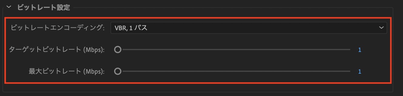 H.264など使用するコーデックによってはビットレートの変更が行なえます。設定は好みで問題ありませんが、ファイルサイズを抑えたいのであれば「VBR, 1パス」のターゲットビットレートを「1Mbps」に設定すると良いでしょう。