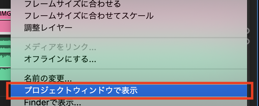 シーケンスで斜線の入ったクリップを選択し、右クリックから「プロジェクトウィンドウで表示」をクリックします。