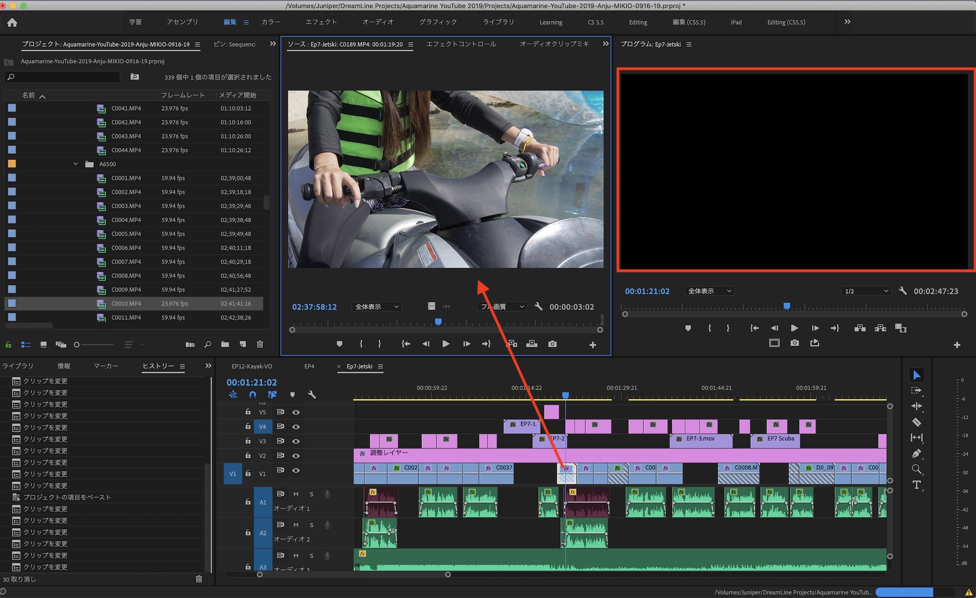 しかし、プログラムウィンドウを見てみるとクリップが表示されていないか、イン・アウトのタイミングがずれていたりします。筆者の場合は写真の通り、黒い画面しか表示されていませんでした。