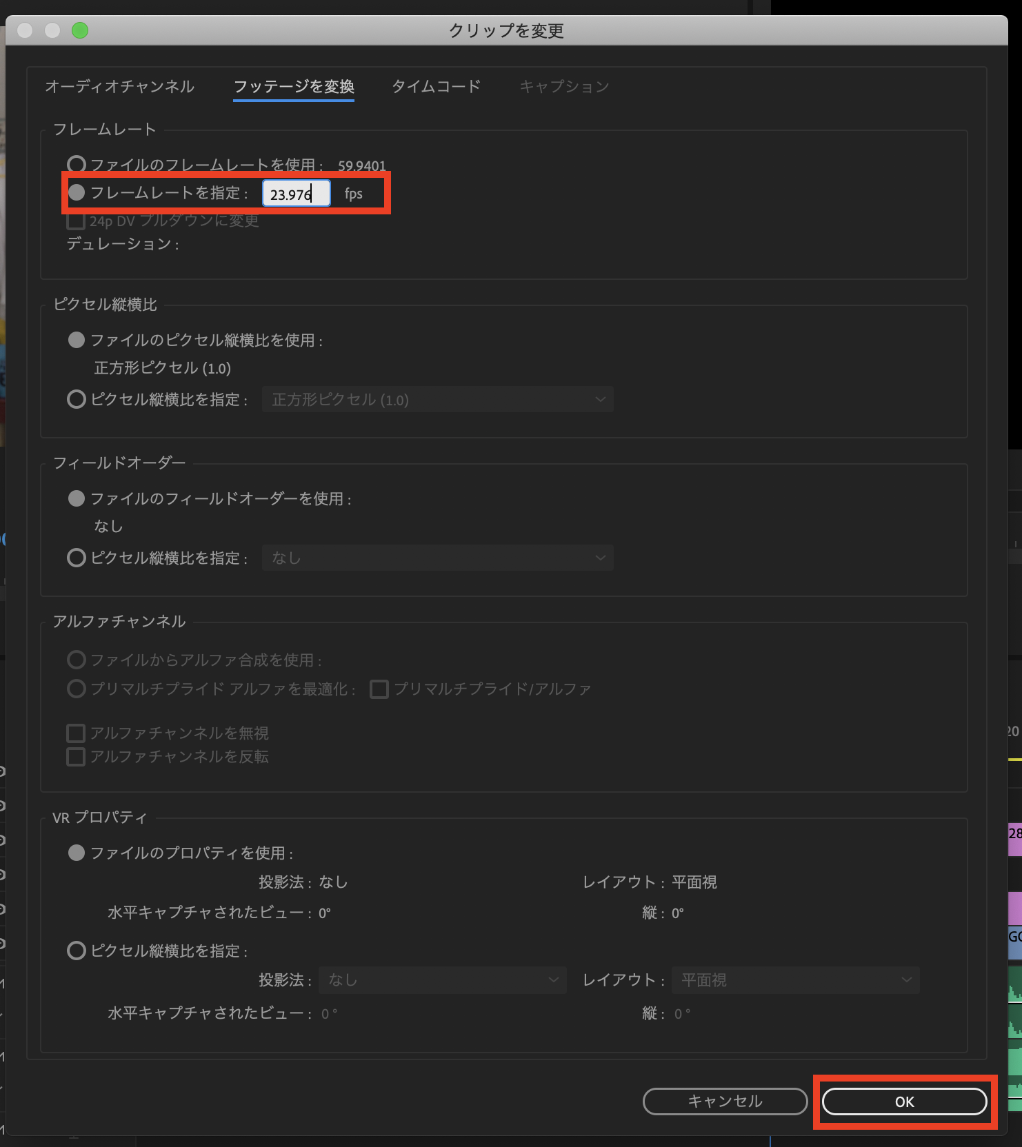 筆者の場合はプロジェクトが24fpsなので「23.976fps」を入力しました。フレームレートを入力したら「OK」をクリックします。
