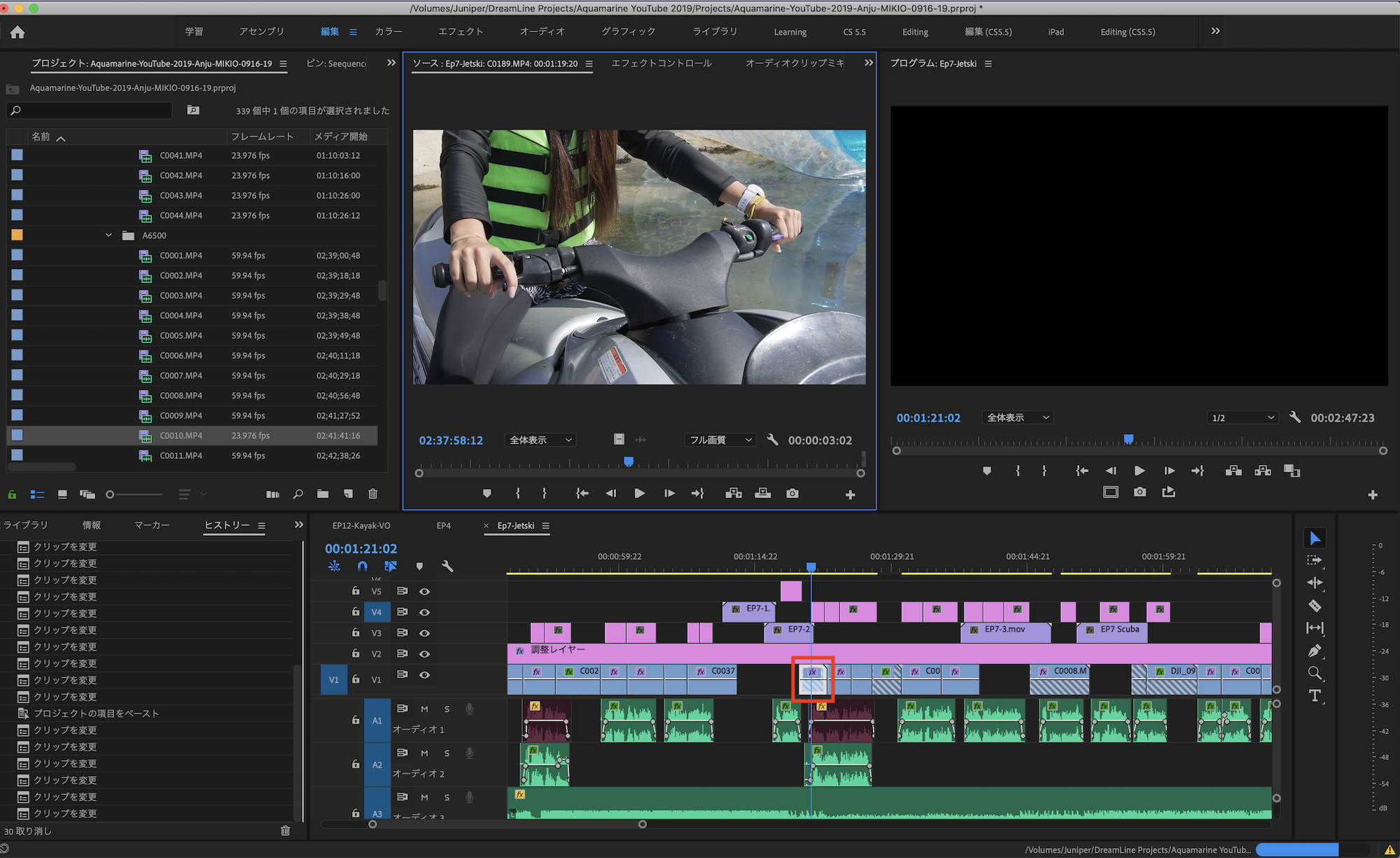 筆者の場合は元々「 60fps」で撮影された映像素材を「24fps」のシーケンスで編集していたのですが、2つのプロジェクトを統合する際にシーケンスにある一部の素材が「24fps」に変換されていなかったのが原因でこのような現象が起きていました。