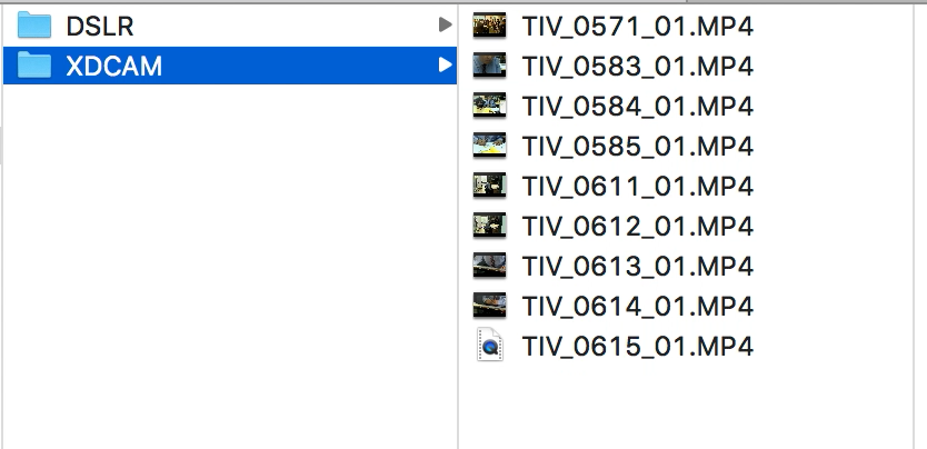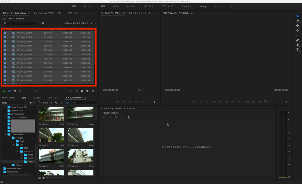 下記のプロジェクトウィンドウではXDCAM PMW-EX3で撮影された映像素材があります。MP4形式にはなっていますが、コーデックを揃えていない限りQuicktime Playerなどのメディアプレイヤーで再生できないので、他人に渡す場合は変換する必要があります。