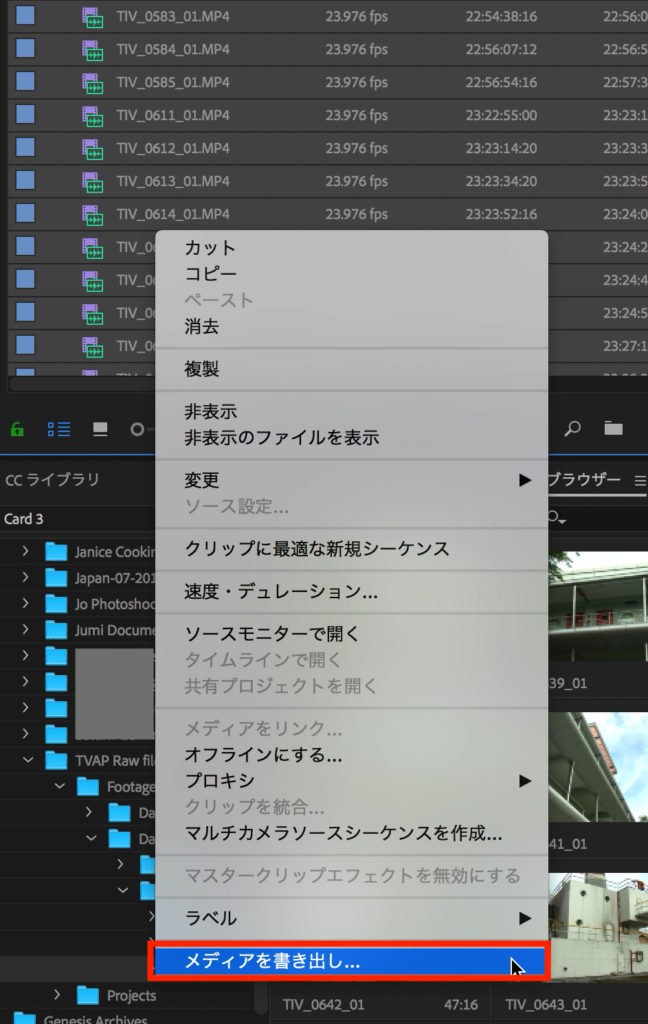 変換したいフッテージ(映像素材)を選択して右クリックすると「メディアを書き出し」があるので、クリックします。