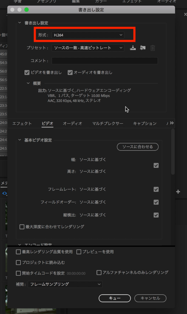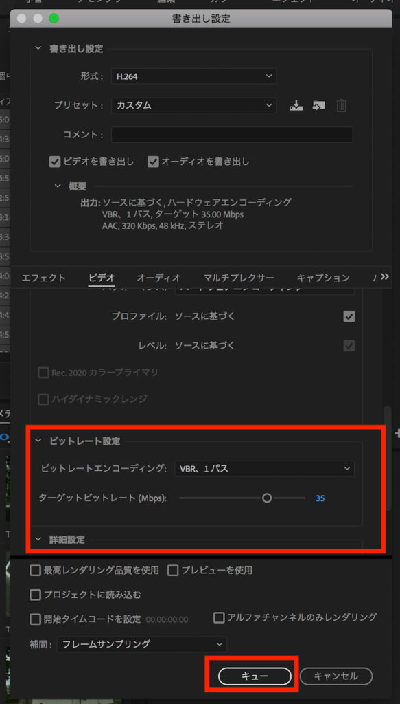 こちらのウィンドウではPremiere Proで見られる書き出しと同じなので、ビットレートなど必要な設定も加える事ができます。撮影されたビットレートに合わせるのがベストなので、数値も変更しておくと良いでしょう。