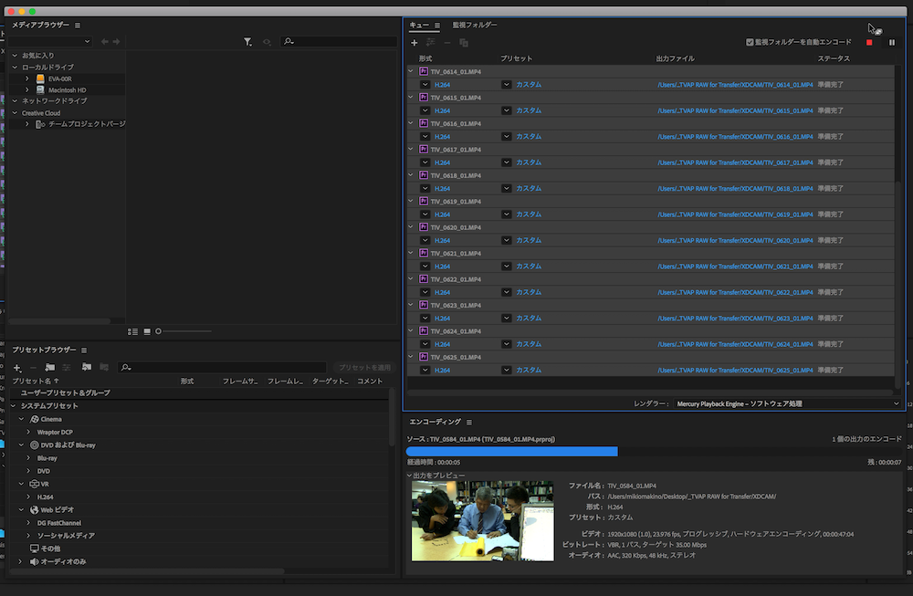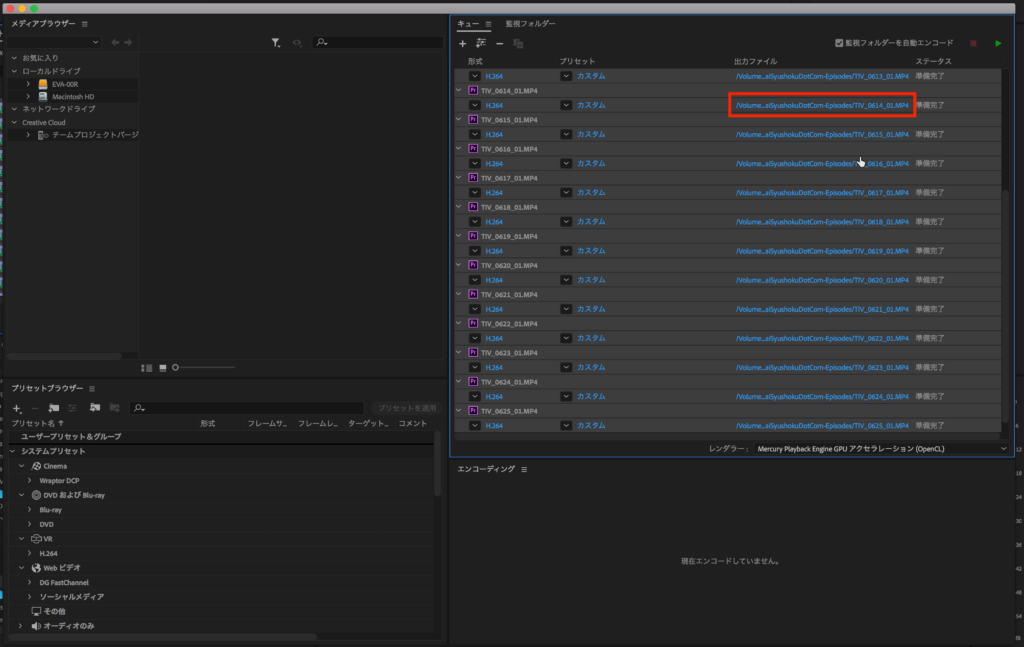 全ての設定が出来たら「キュー」をクリックし、Media Encoderを起動させます。