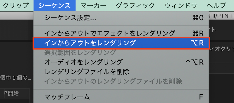 既にレンダリング済みのシーケンスの場合は黄色または赤に変わるので、上部メニューの「シーケンス」から「インからアウトをレンダリング」をクリックして、レンダリングを行います。