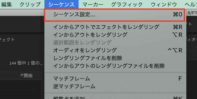 まず進行中のプロジェクトを一度保存し、バックアップを取ります。必要ない方はこのステップをスキップして、Premiere Proの上部メニュー、「シーケンス」から「シーケンス設定」をクリックします。