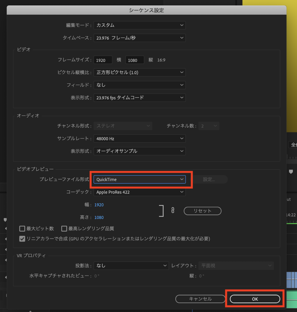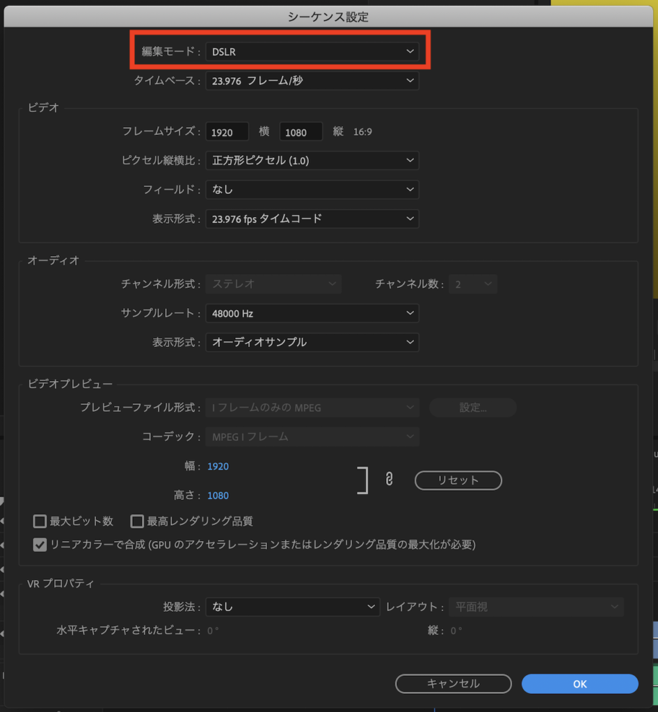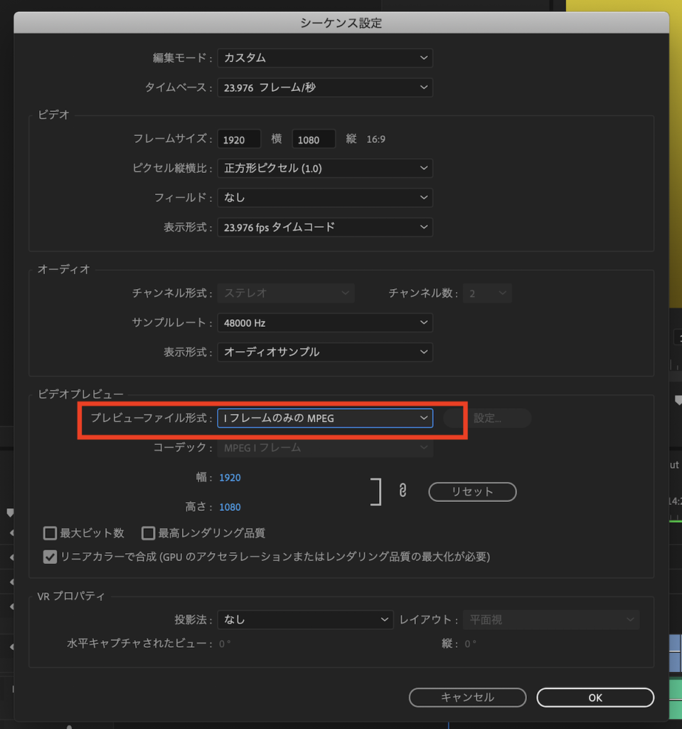 そんな時は「シーケンス設定」内にある「ビデオプレビュー」のファイル形式を変更することで、この問題を対処できるかもしれません。