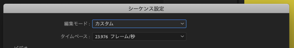 シーケンス設定を開くと、色々な設定が表示されます。まず一番上の「編集モード」を「カスタム」に変更します。