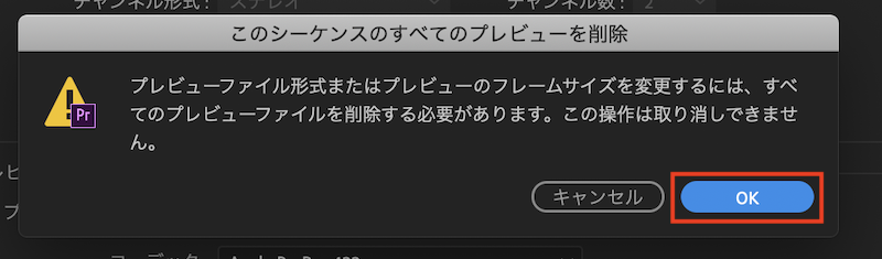 新しい設定を反映するためにレンダリングファイルが削除されます。元のデータや編集では特に影響を受けないので、「OK」をクリックしましょう。
