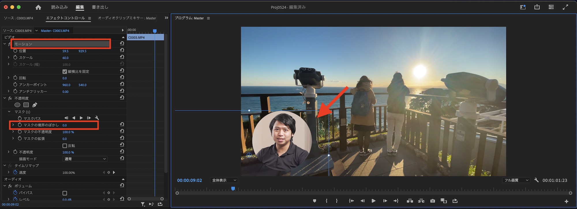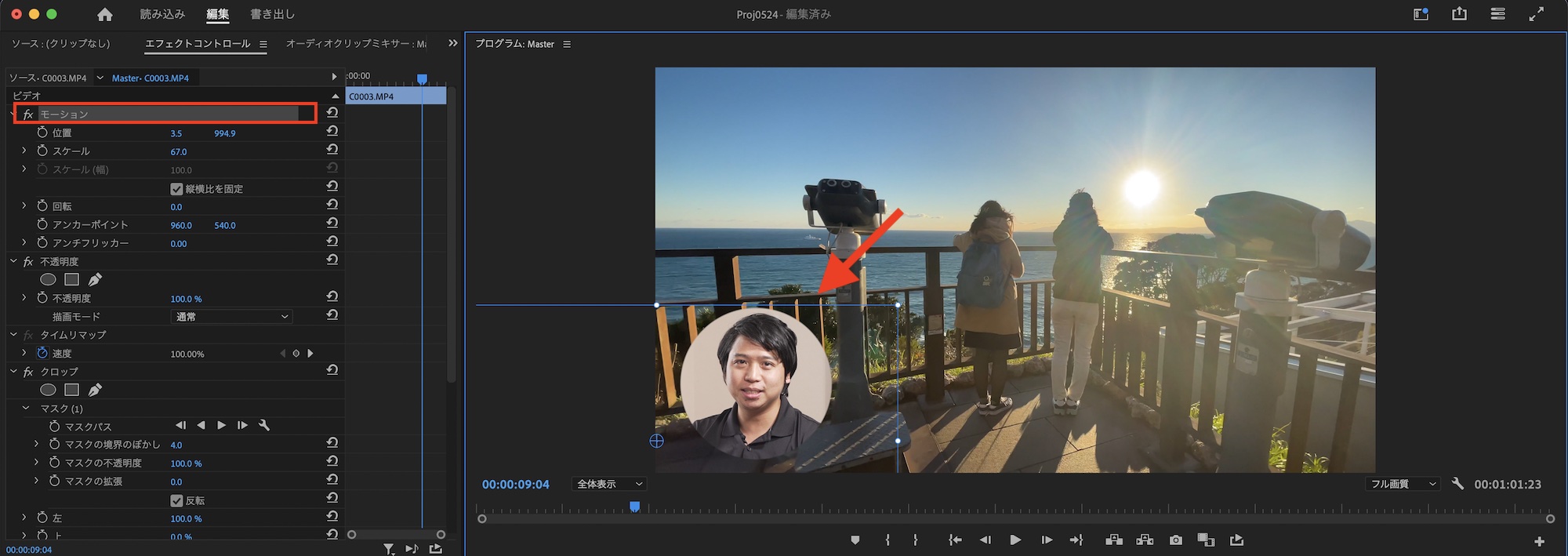 マスクのエッジは今回ぼかしたくないので、「マスクの境界のぼかし」を「0」にし、スケールと位置を使ってPiPの位置を調整します。パラメータの数値を入力しても良いのですが、「モーション」をクリックするとプログラムモニター上で直接操作できるので、こちらをおすすめします。